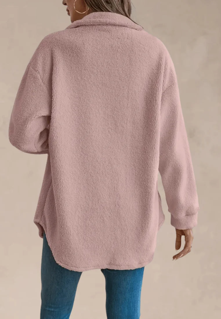 Urocza kurtka koszulowa różowa z miękkiego futerka zapinana na guziki to połączenie kobiecego stylu i wygody. Wykonana z przyjemnego, pluszowego materiału, zapewnia ciepło i komfort w chłodniejsze dni. Luźny krój z obniżoną linią ramion oraz klasyczny kołnierzyk nadają jej casualowego, ale modnego charakteru.
