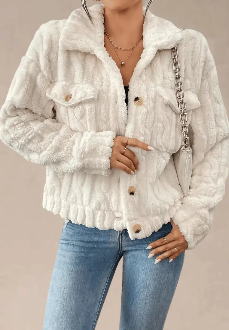Stylowa krótka kurtka z miękkiego futerka w kolorze białym to doskonały wybór na chłodniejsze dni. Wykonana z wyjątkowo przyjemnego w dotyku, puszystego materiału zapewnia ciepło i komfort, jednocześnie dodając stylizacji eleganckiego, kobiecego charakteru. Guziki w kontrastowym odcieniu nadają jej szyku, a krótki krój pięknie podkreśla talię.