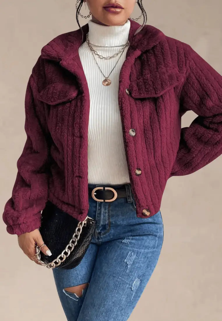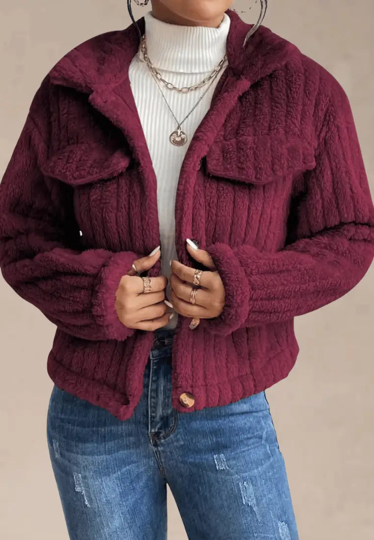 Bordowa kurtka damska polarowa oversize z guzikami do pasa