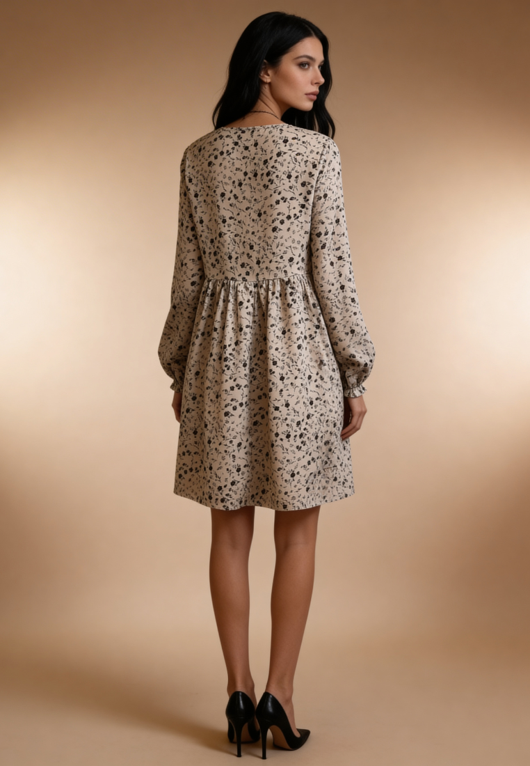 Postaw na lekkość i swobodę z luźną sukienką w drobne czarne kwiaty na beżowym tle. Ten model to idealna propozycja dla kobiet ceniących wygodę połączoną z subtelnym stylem. Zwiewny fason z delikatnym odcięciem pod biustem pięknie układa się na sylwetce, a długi rękaw zakończony lekkim ściągaczem dodaje całości dziewczęcego uroku.