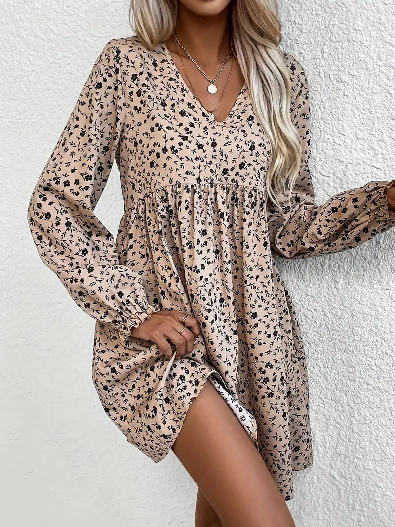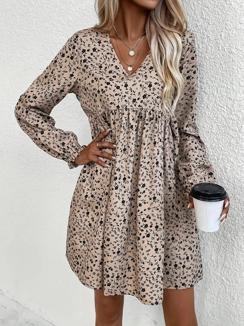Wzór w drobne, kontrastowe kwiatuszki na tle w odcieniu beżu sprawia, że sukienka doskonale sprawdzi się zarówno w codziennych stylizacjach, jak i na luźniejsze wyjścia. To ponadczasowy fason, który możesz nosić przez cały rok.