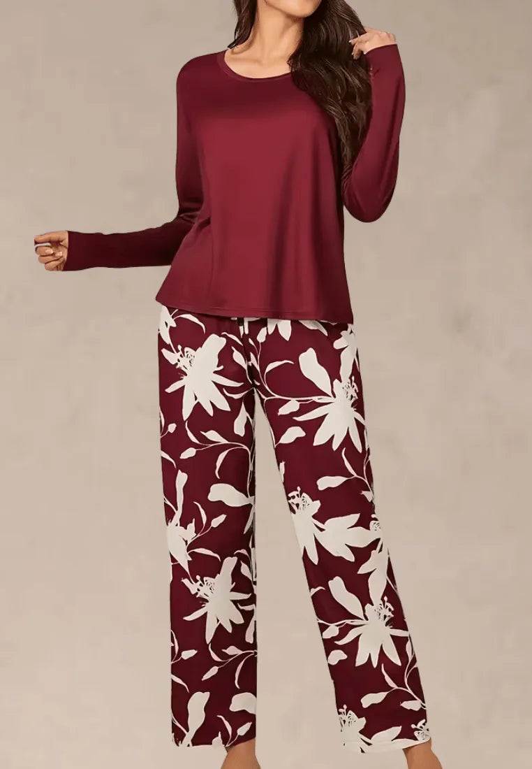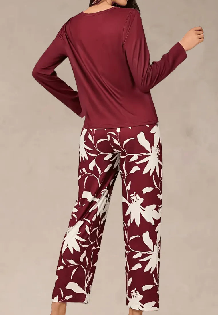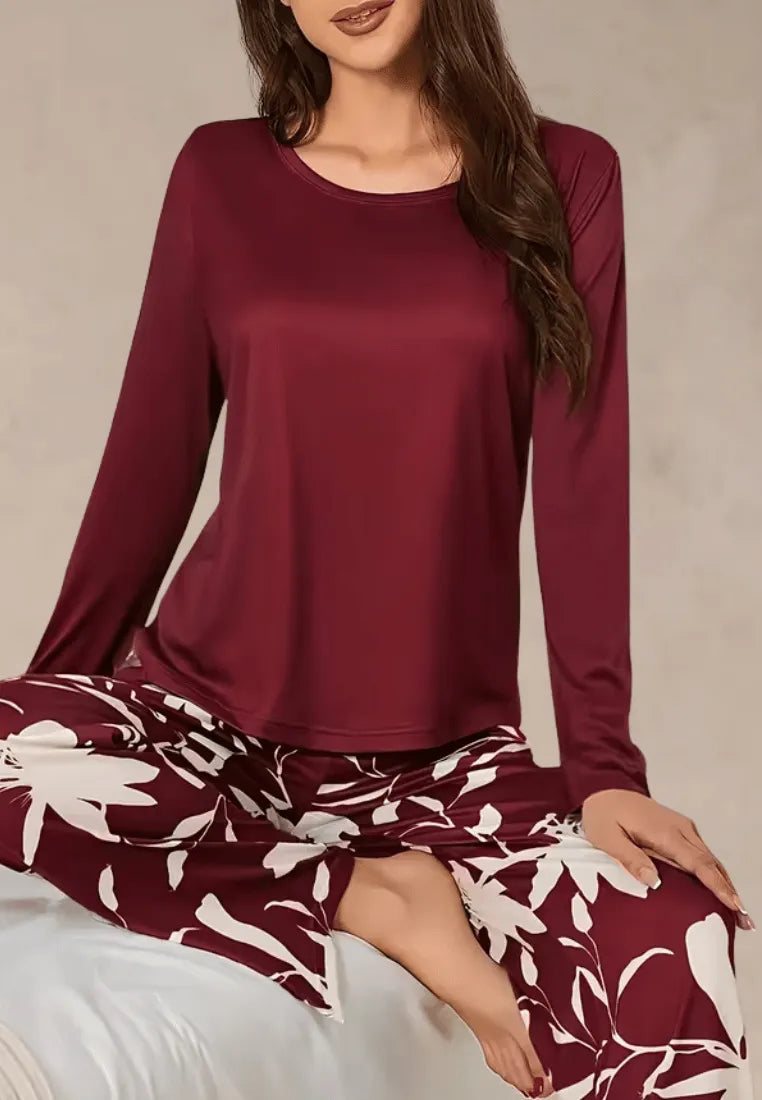 Elegancki i niezwykle komfortowy komplet piżamowy w głębokim bordowym kolorze, który doskonale sprawdzi się na chłodniejsze wieczory i poranki. Gładka koszulka z długim rękawem ma klasyczny, minimalistyczny fason, który pięknie podkreśla sylwetkę i zapewnia pełną swobodę ruchów.