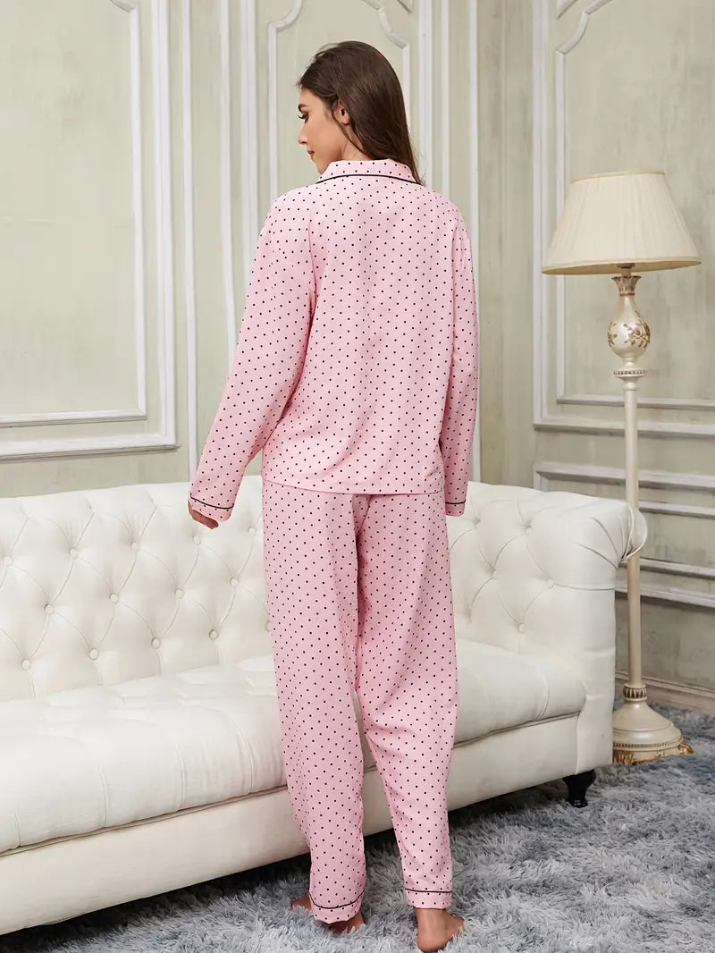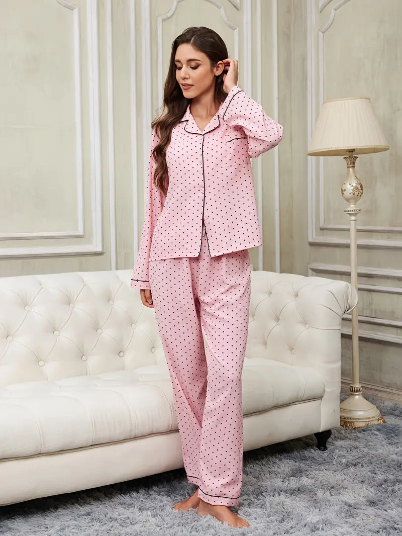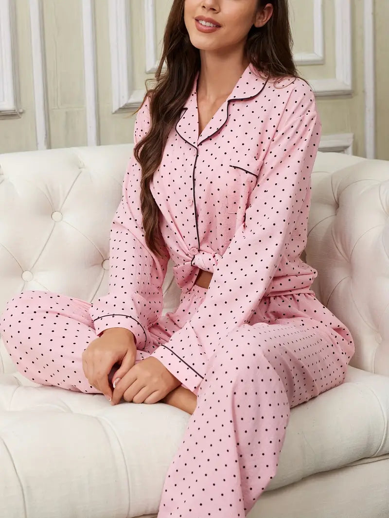 Piżama damska w groszki z długim rękawem i guzikami w kolorze pudrowego różu