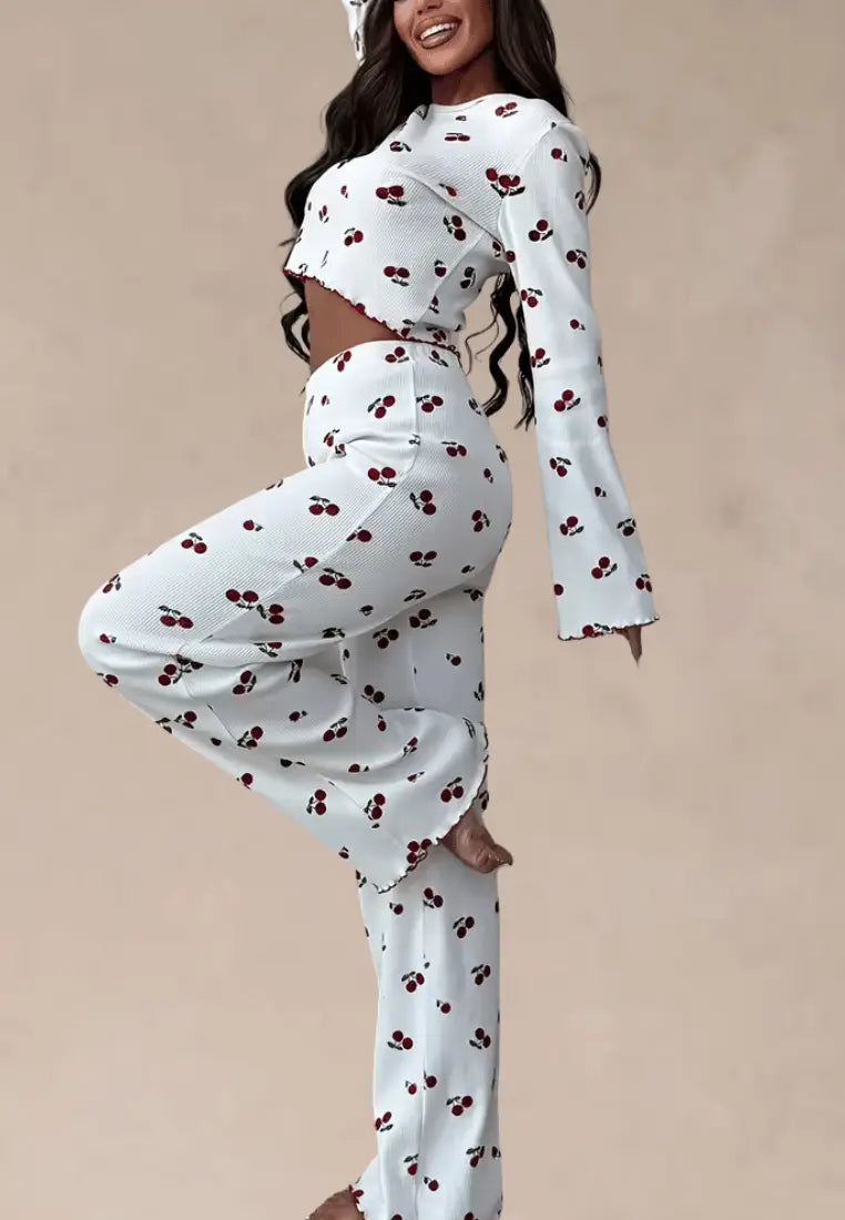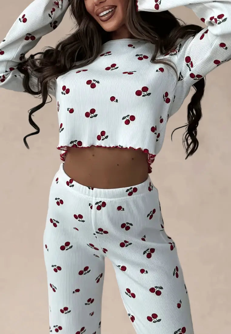 ✨ Piżamka biała w wisienki z długimi rękawami i szerokimi spodniami