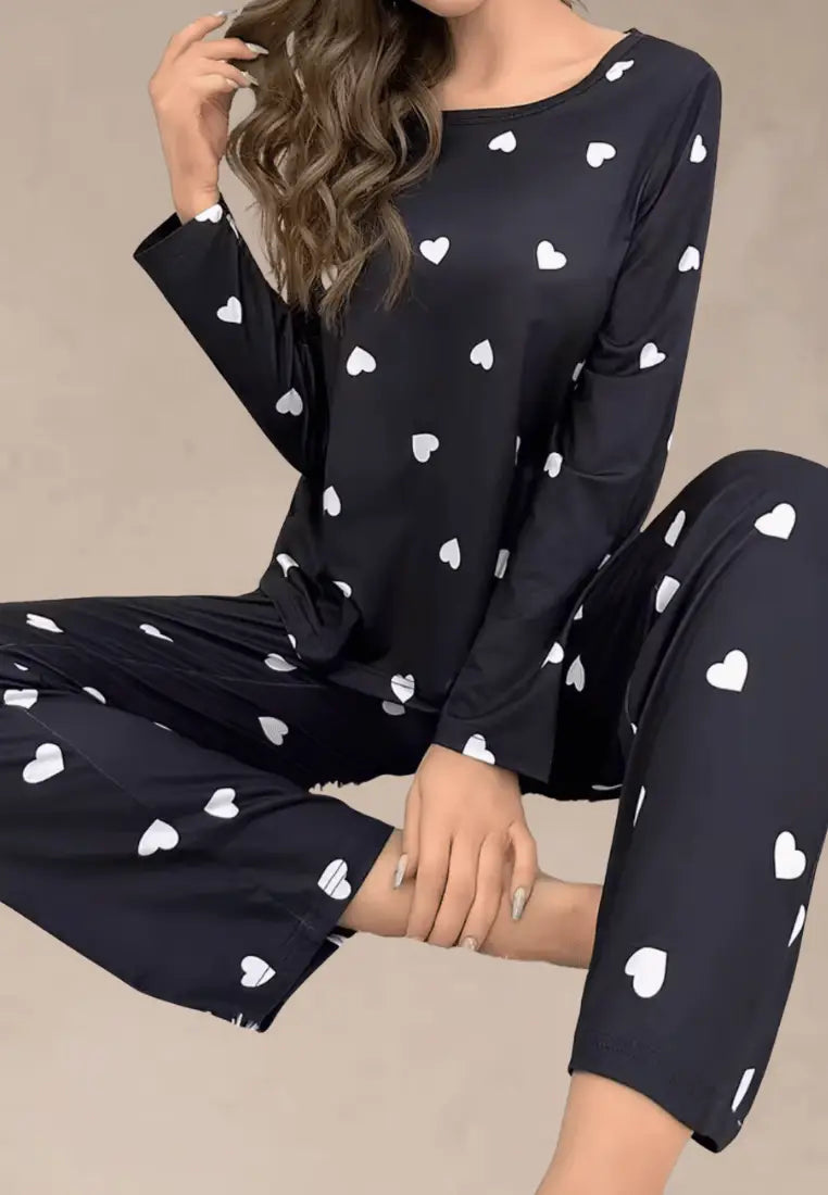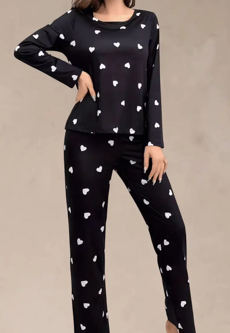 Czarny komplet piżamowy damski z długim rękawem i długimi spodniami w białe serca