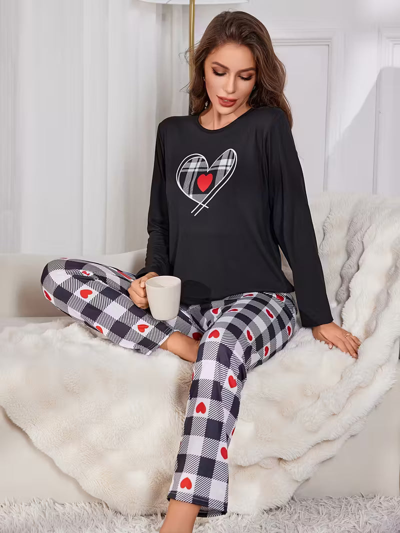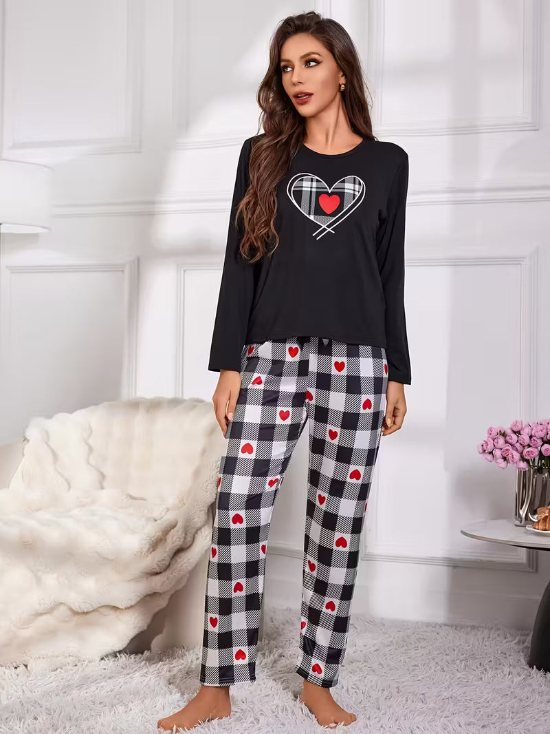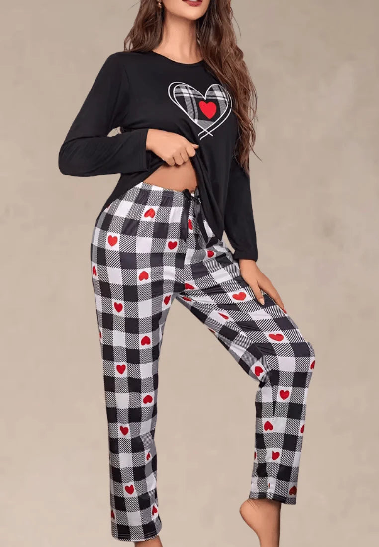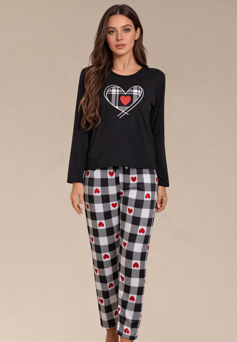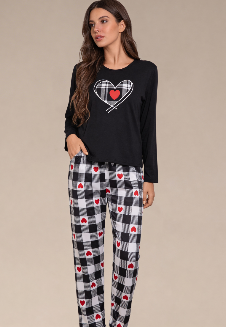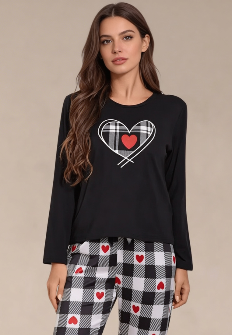 Bluzka z długim rękawem w klasycznej czerni ozdobiona została nadrukiem serca, co dodaje całości subtelnej romantycznej nuty. Spodnie w czarno-białą kratę z czerwonymi akcentami w postaci serduszek wyróżniają się nowoczesnym i uroczym wzorem. Luźny fason zapewnia swobodę ruchów, a miękki materiał otula ciało przyjemnym ciepłem.