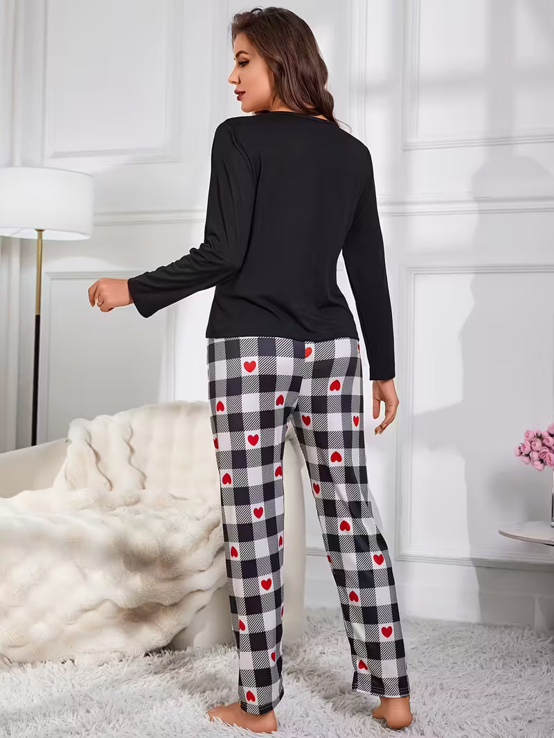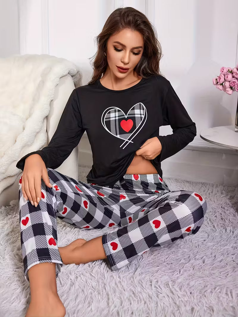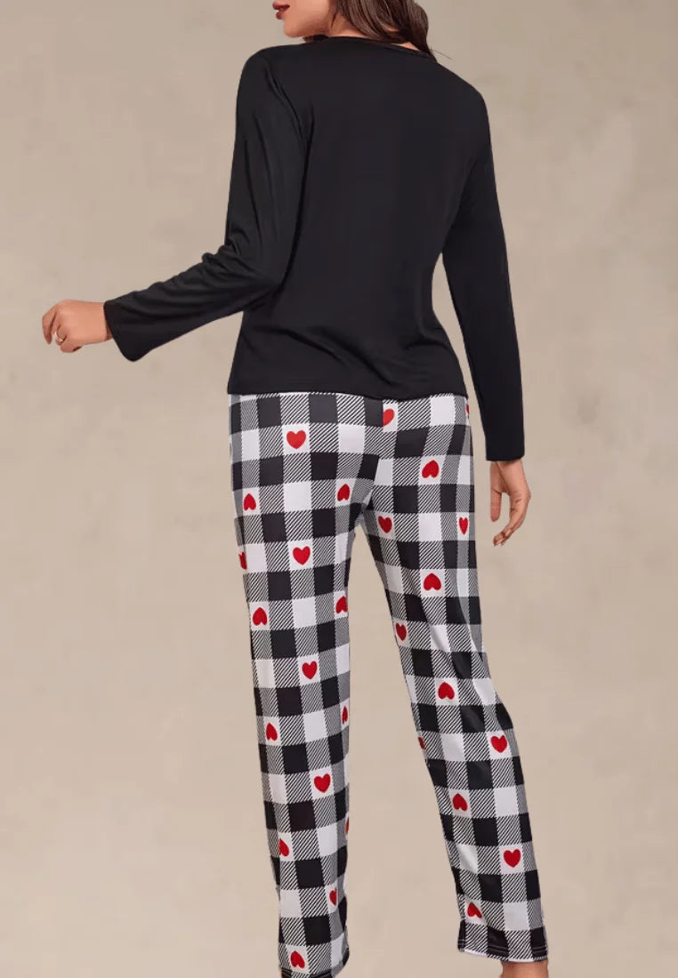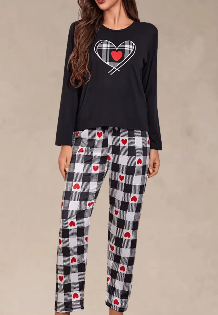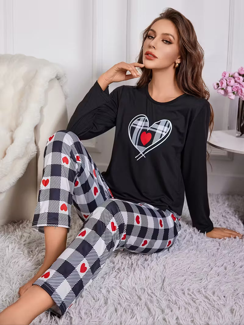 Bluzka z długim rękawem w klasycznej czerni ozdobiona została nadrukiem serca, co dodaje całości subtelnej romantycznej nuty. Spodnie w czarno-białą kratę z czerwonymi akcentami w postaci serduszek wyróżniają się nowoczesnym i uroczym wzorem. Luźny fason zapewnia swobodę ruchów, a miękki materiał otula ciało przyjemnym ciepłem.