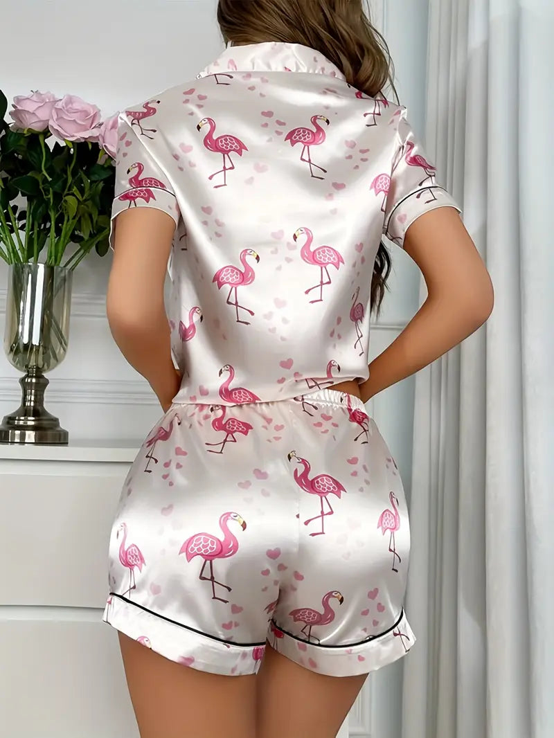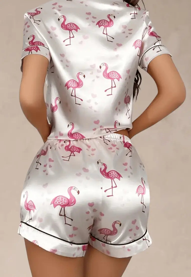 Piżamka damska satynowa z nadrukiem flamingów – stylowy relaks z odrobiną egzotyki 🦩✨