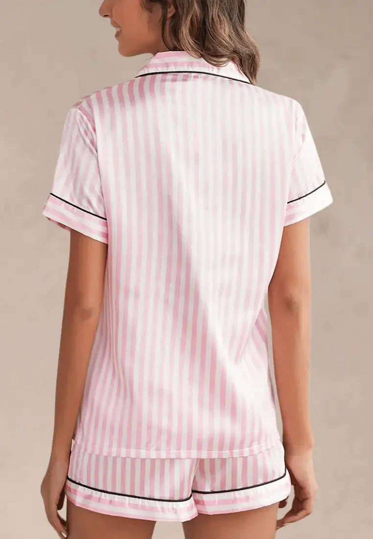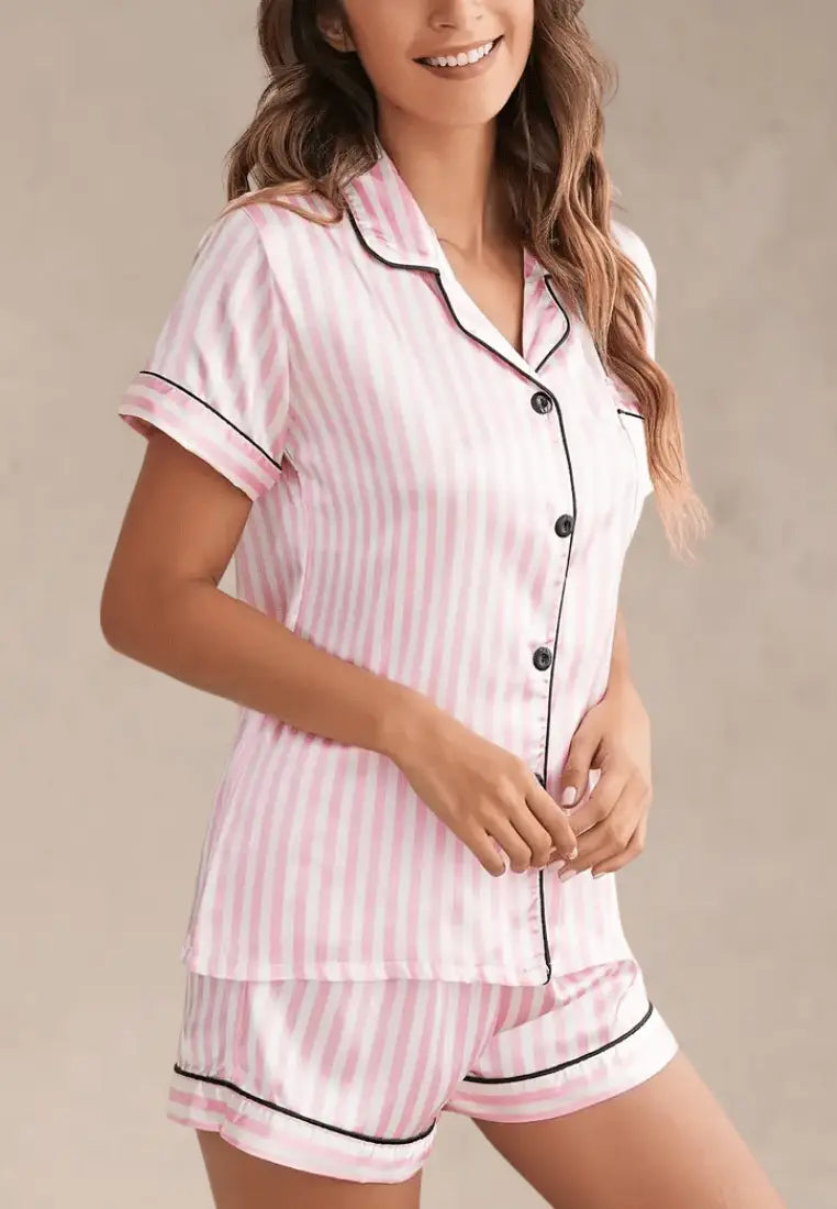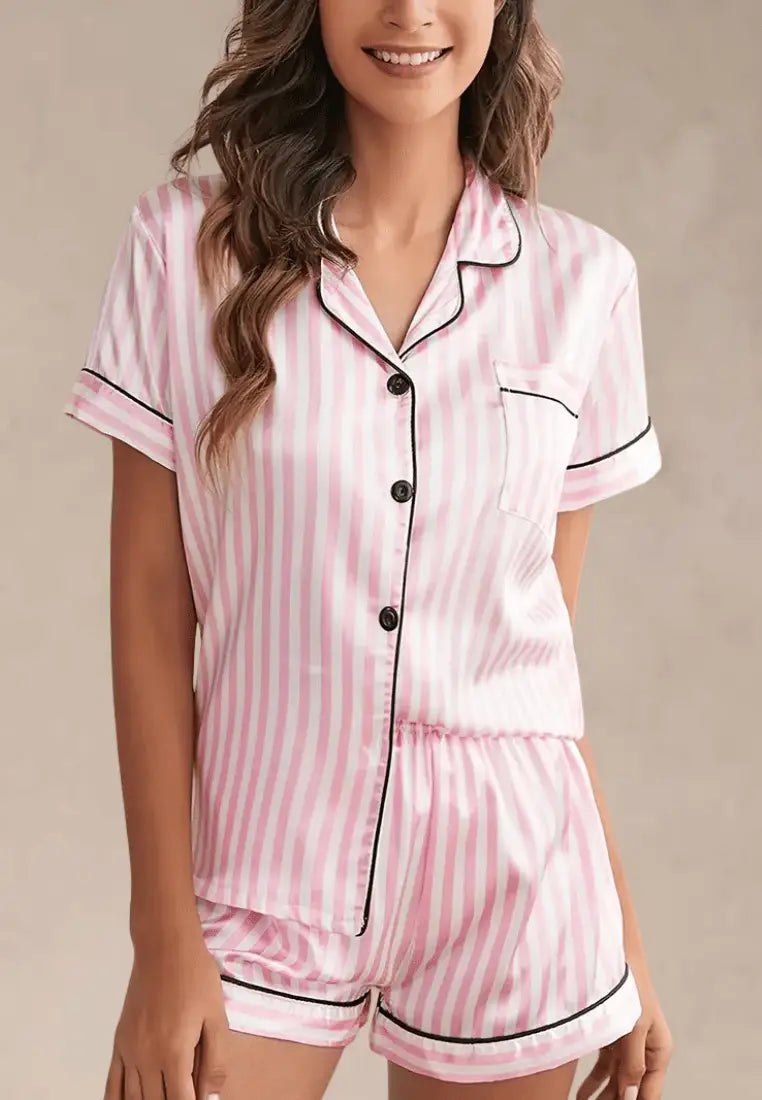 Koszula z krótkim rękawem zapinana na guziki nadaje całości klasycznego charakteru, a delikatne lamówki w kontrastującym kolorze podkreślają styl. Do kompletu dołączone są krótkie spodenki z elastyczną talią, które gwarantują pełen komfort przez całą noc.