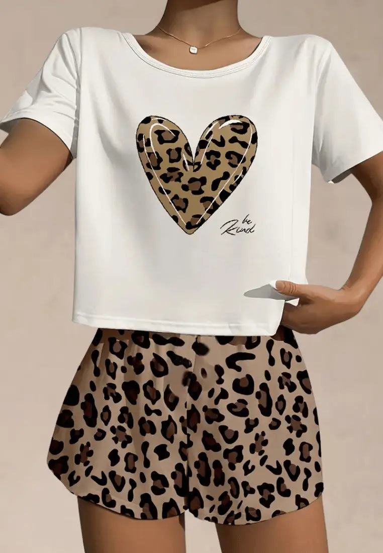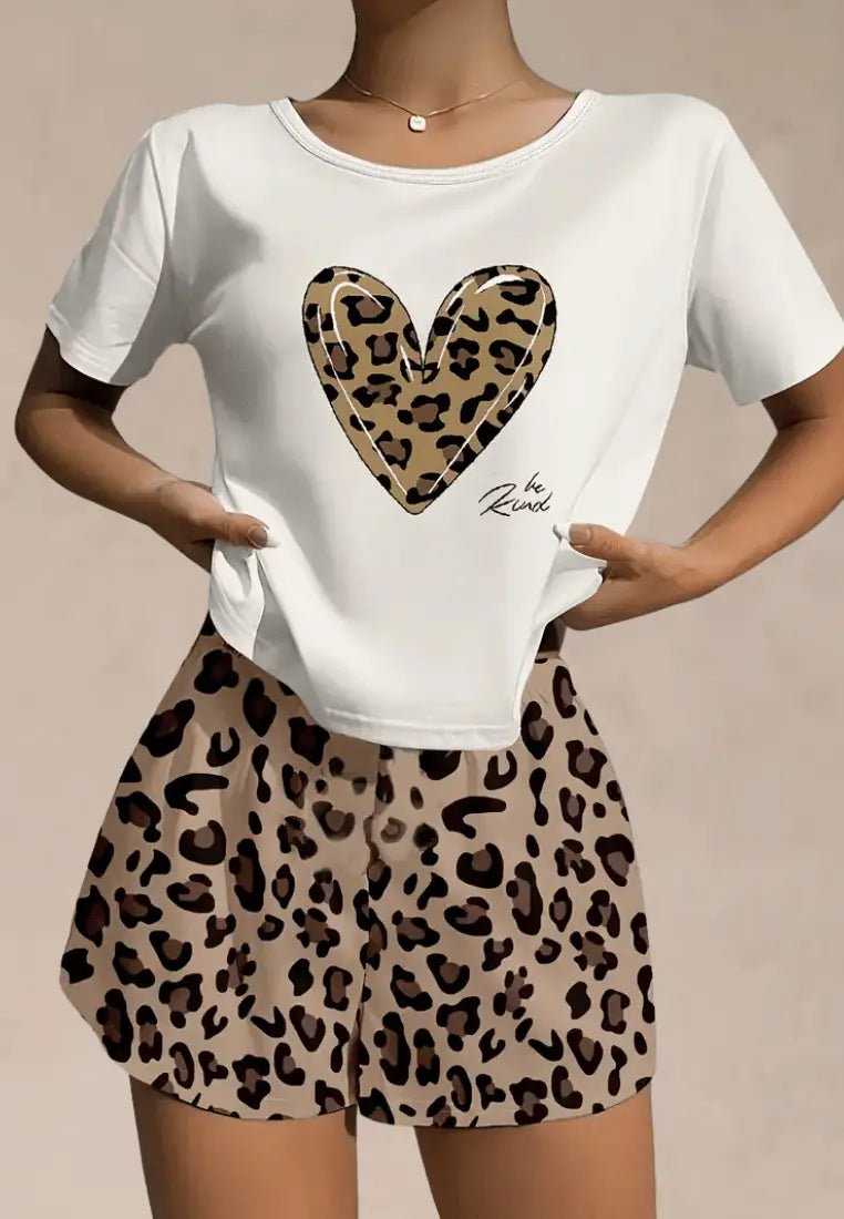 Ten dwuczęściowy zestaw składa się z luźnej, białej koszulki z nadrukiem serca w cętki oraz krótkich szortów w całości pokrytych wzorem w panterkę. Piżamka damska przyciąga wzrok, podkreśla osobowość i jednocześnie zapewnia maksymalną wygodę – idealna zarówno na letnie noce, jak i leniwe poranki w domowym zaciszu.