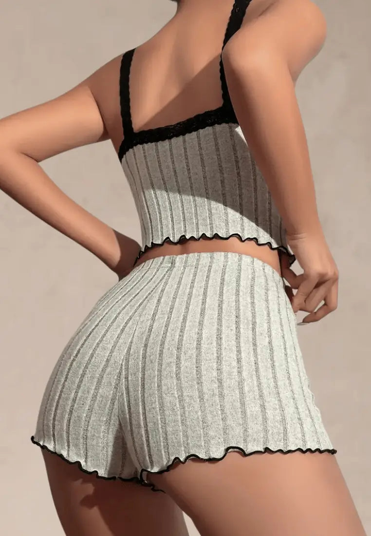 Top na szerokich ramiączkach ozdobiony został delikatną czarną koronką i uroczą kokardką przy dekolcie, dodając całości subtelnego, romantycznego charakteru. Spodenki z wysokim stanem i falowanym wykończeniem nogawek doskonale dopasowują się do sylwetki, zapewniając swobodę ruchów. Elastyczna dzianina w prążki sprawia, że komplet jest nie tylko stylowy, ale i przyjemny w noszeniu.