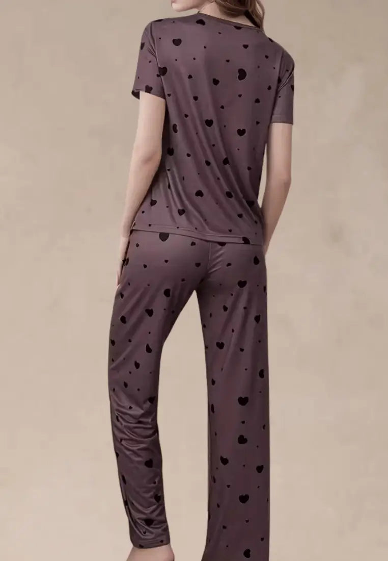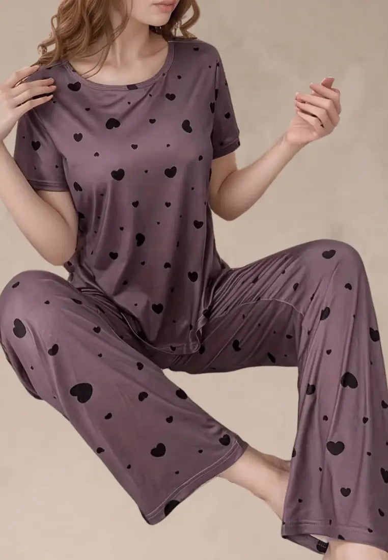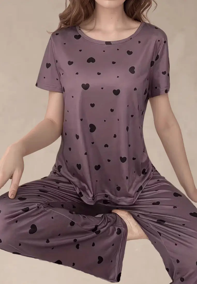 Fioletowy komplet piżamowy damski z krótkim rękawem i długimi spodniami w czarne serca