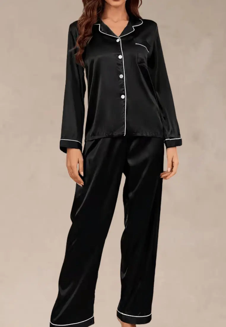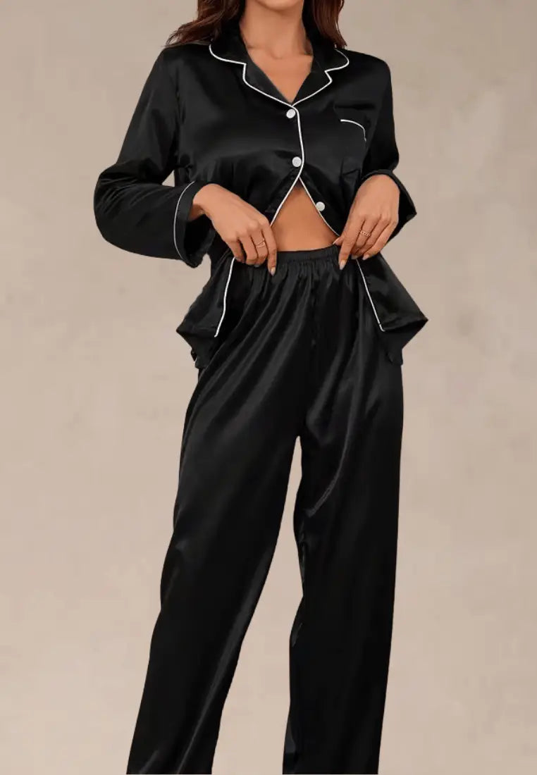 Czarny komplet piżamowy damski satynowy z długim rękawem i długimi spodniami