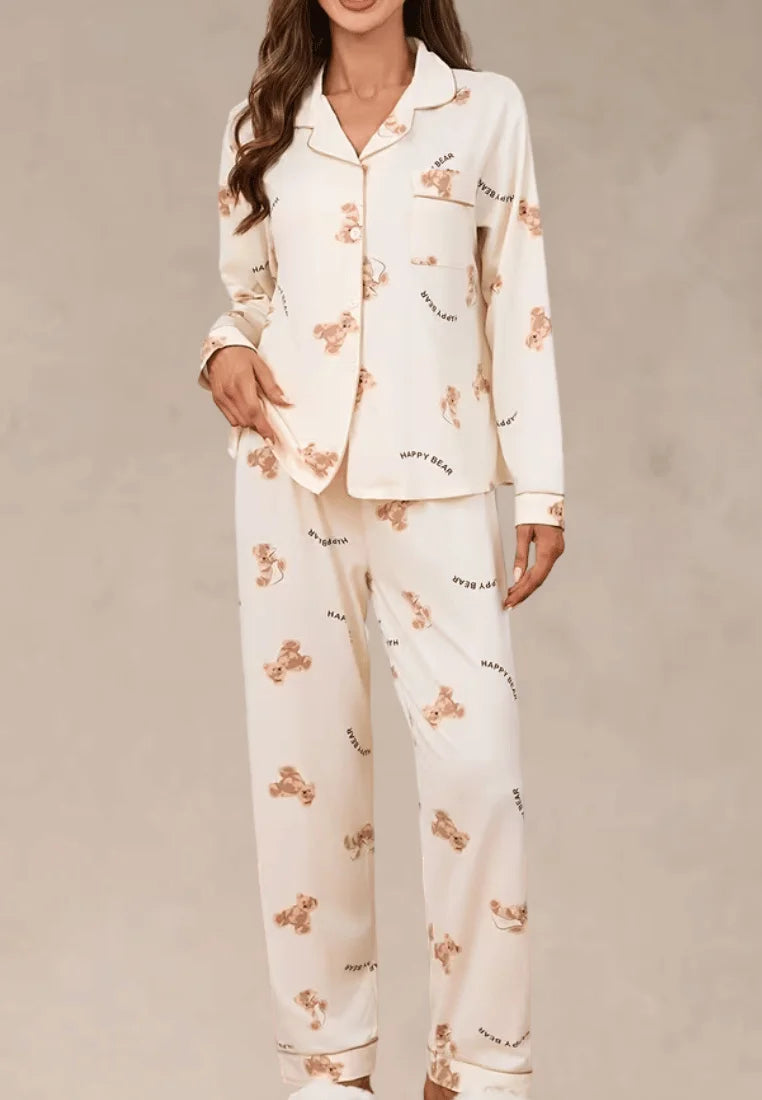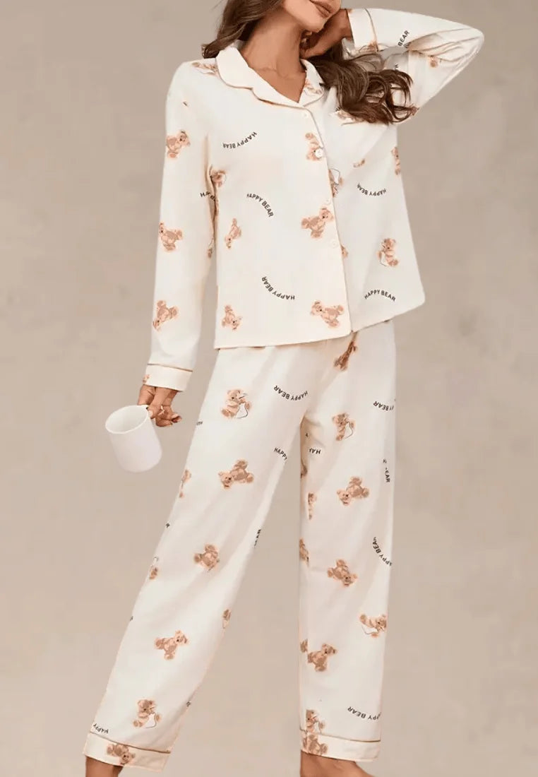 Urocza piżama damska w kolorze ecru, ozdobiona nadrukiem pluszowych misiów i napisem „HAPPY BEAR”. Komplet składa się z koszuli z długim rękawem i kieszonką na piersi oraz długich, prostych spodni. Luźny krój i miękki materiał zapewniają pełen komfort podczas snu i wypoczynku. Delikatne wykończenia w kontrastującym odcieniu dodają całości stylowego charakteru.