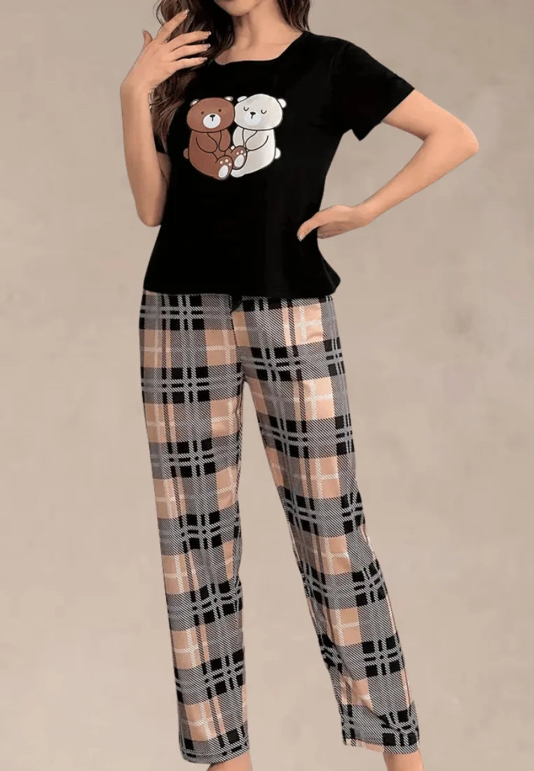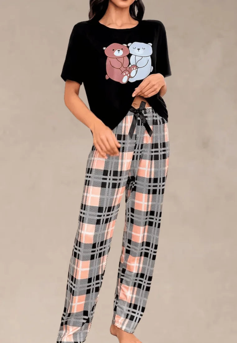 Postaw na wygodę i uroczy design z czarną piżamką damską. Zestaw składa się z luźnej koszulki z krótkim rękawem, ozdobionej nadrukiem dwóch słodkich misiów, oraz długich spodni w klasyczną kratę w odcieniach szarości, czerni i pudrowego różu. Miękki i przyjemny w dotyku materiał sprawia, że piżamka doskonale nadaje się zarówno do snu, jak i do domowego relaksu. To idealne połączenie komfortu i dziewczęcego uroku.