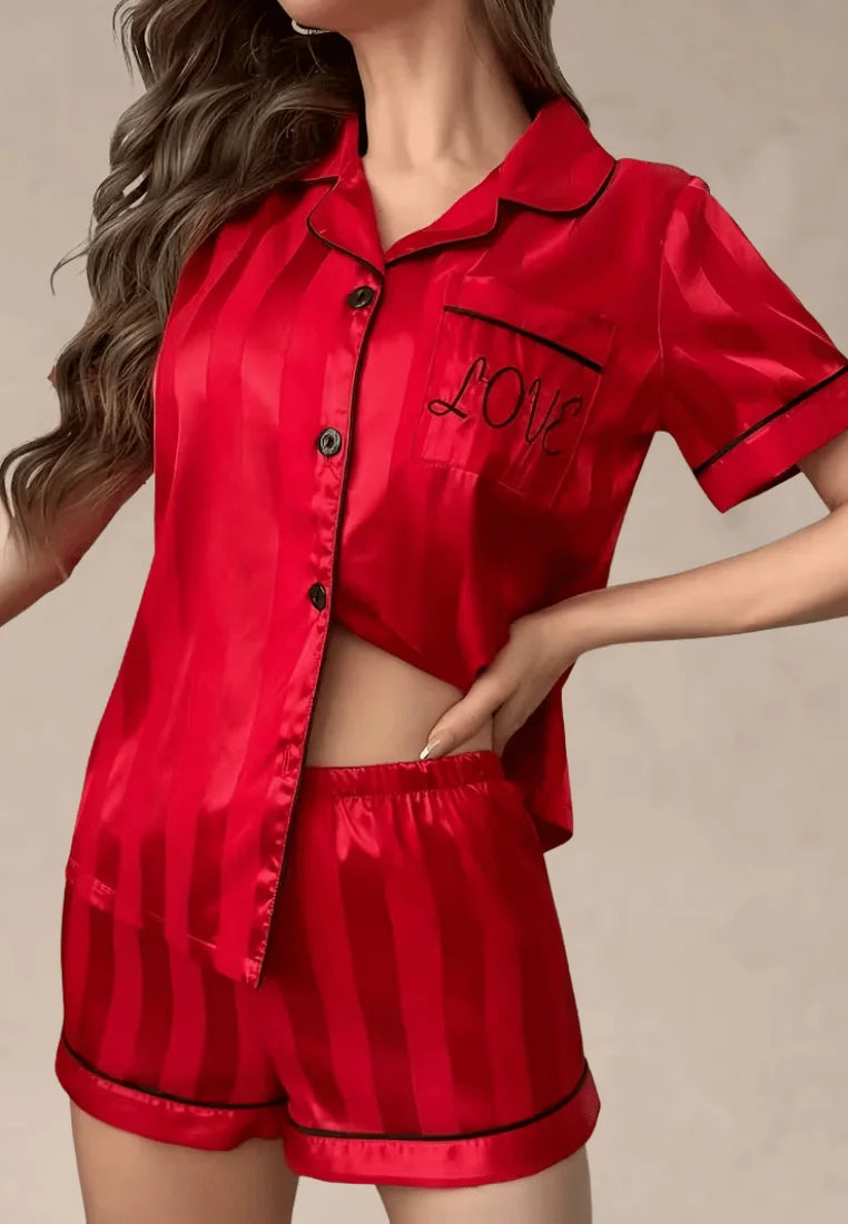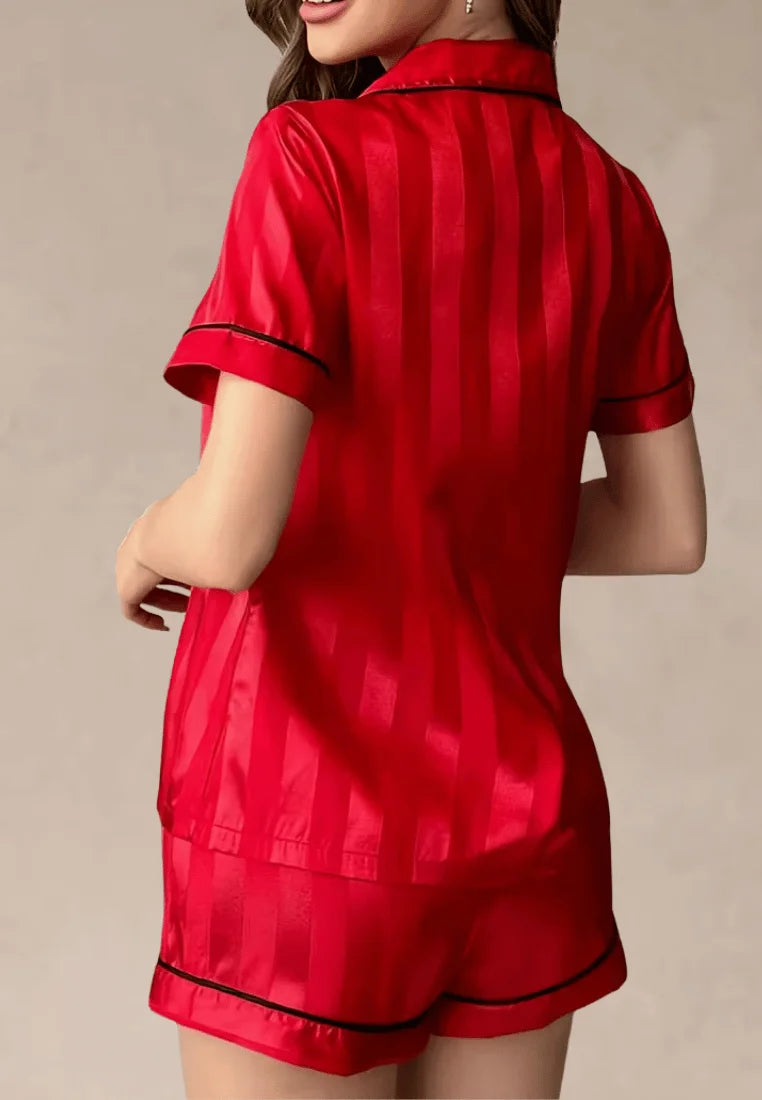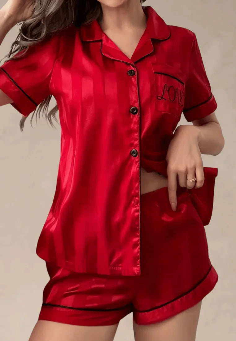 Czerwony komplet piżamowy damski satynowy z krótkim rękawem i spodenkami
