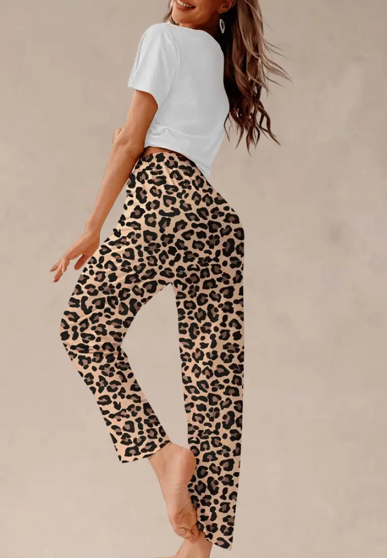 Długie spodnie z efektownym printem w panterkę zapewniają maksymalny komfort dzięki luźnemu krojowi i elastycznej talii z wiązaniem. To idealny komplet do noszenia nie tylko do spania, ale również na spokojne poranki, weekendowy relaks czy domowe SPA.