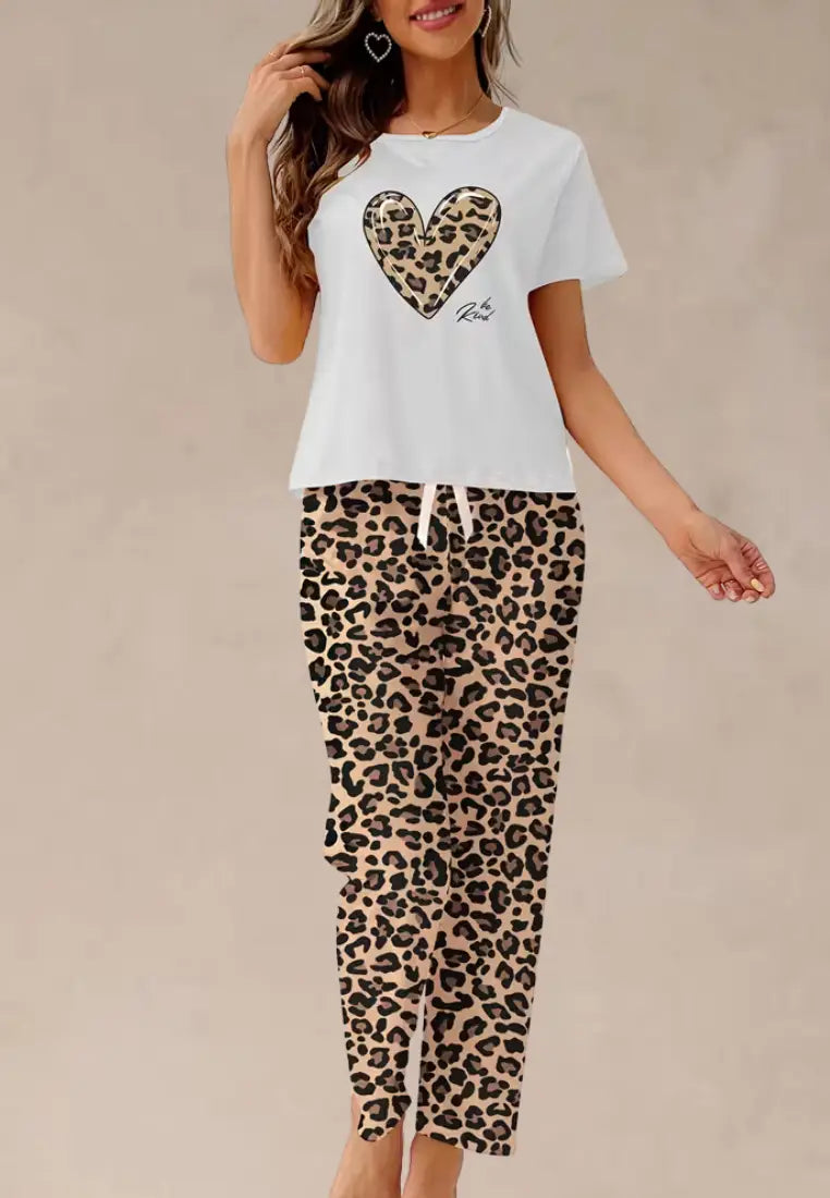 Dodaj odrobinę dzikości do swoich wieczornych stylizacji z piżamką z nadrukiem serca i spodniami w panterkę w stylu safari. Ten dwuczęściowy zestaw łączy w sobie wygodę i modny look, który przyciąga spojrzenia. Górę stanowi klasyczny biały T-shirt z krótkim rękawem, ozdobiony nadrukiem serca w cętki – to kobiecy akcent z nutą charakteru.