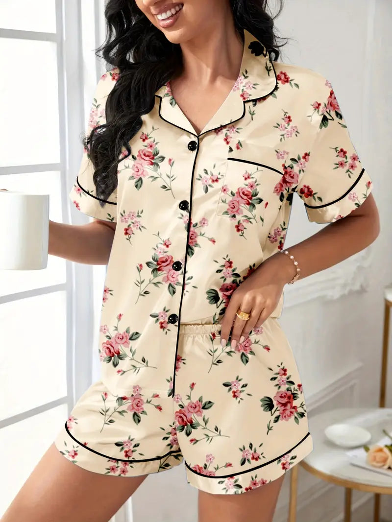 Piżamowy komplet satynowy w kremowe kwiaty z czarną lamówką