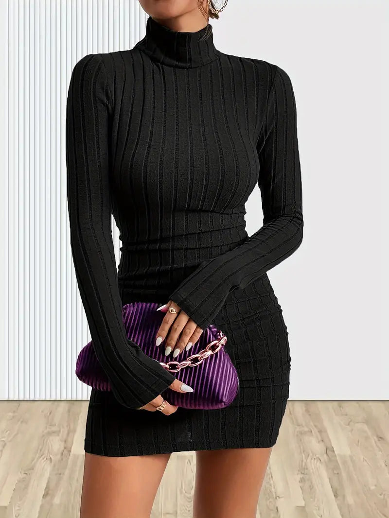 Prążkowana sukienka dzianinowa mini z golfem w kolorze czarnym