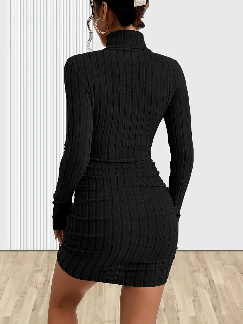 Odkryj kobiecy minimalizm w najlepszym wydaniu z prążkowaną sukienką dzianinową mini z golfem w kolorze czarnym. To model, który idealnie łączy elegancję, wygodę i seksowny styl. Dopasowany fason pięknie podkreśla kobiecą sylwetkę, a elastyczna dzianina zapewnia pełen komfort noszenia – nawet przez cały dzień.