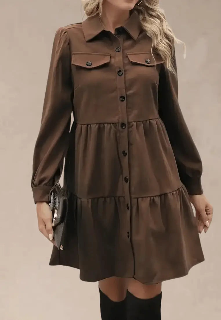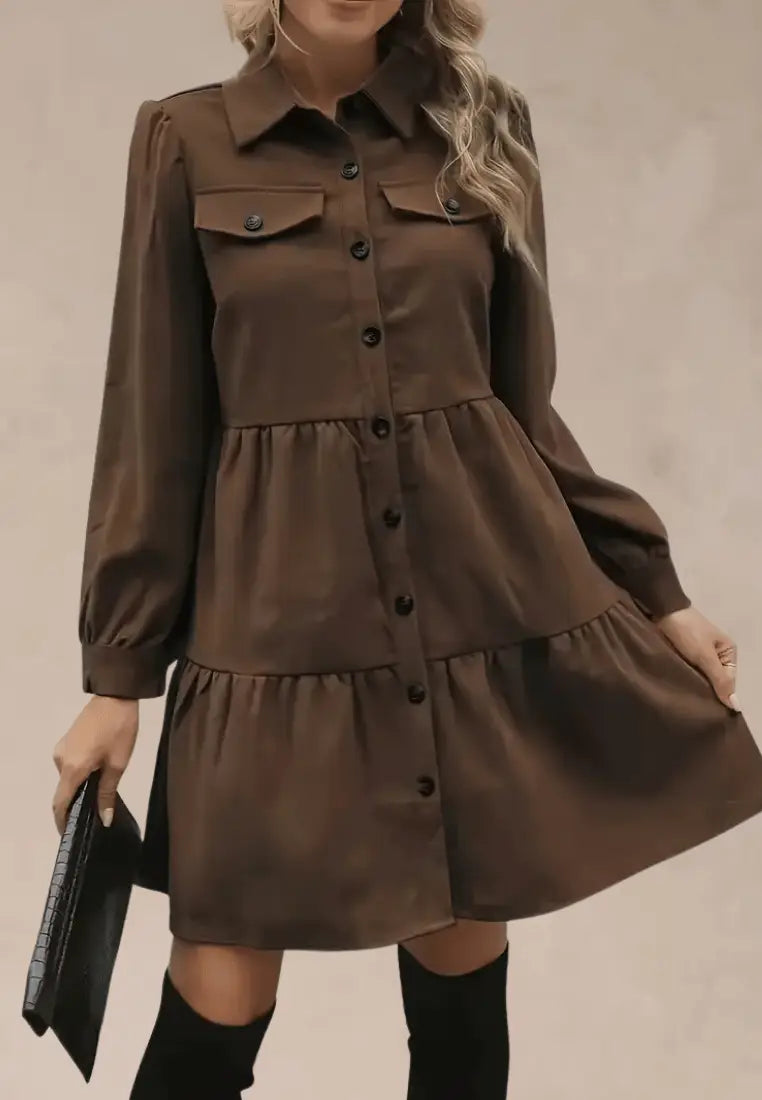 Brązowa koszulowa sukienka z guzikami i rozkloszowanym dołem