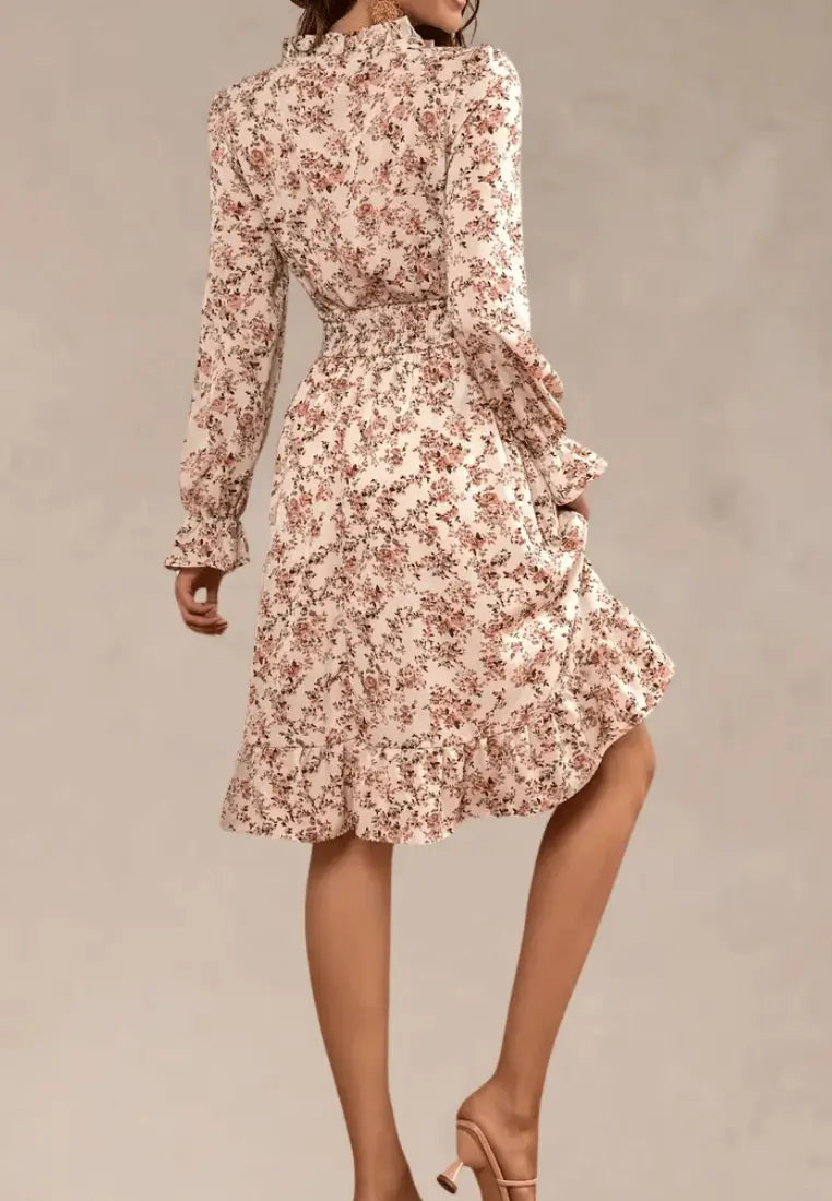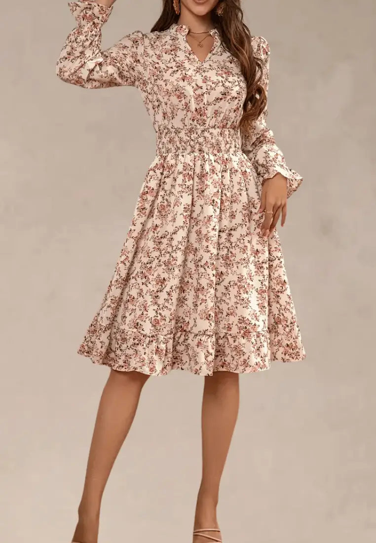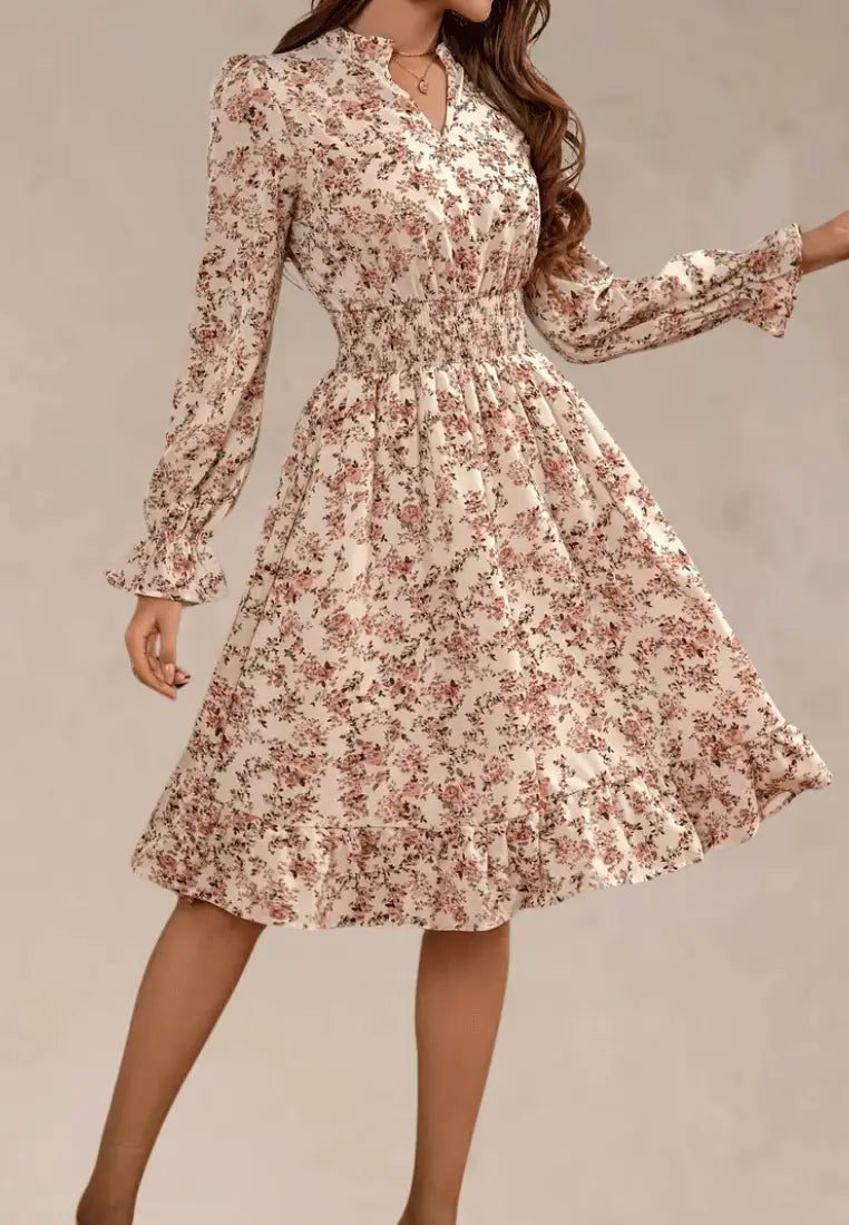 Kremowa sukienka midi w kwiaty z gumką w talii i długim rękawem