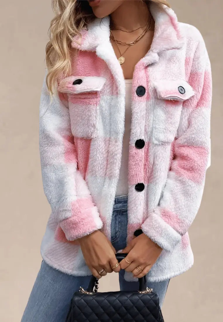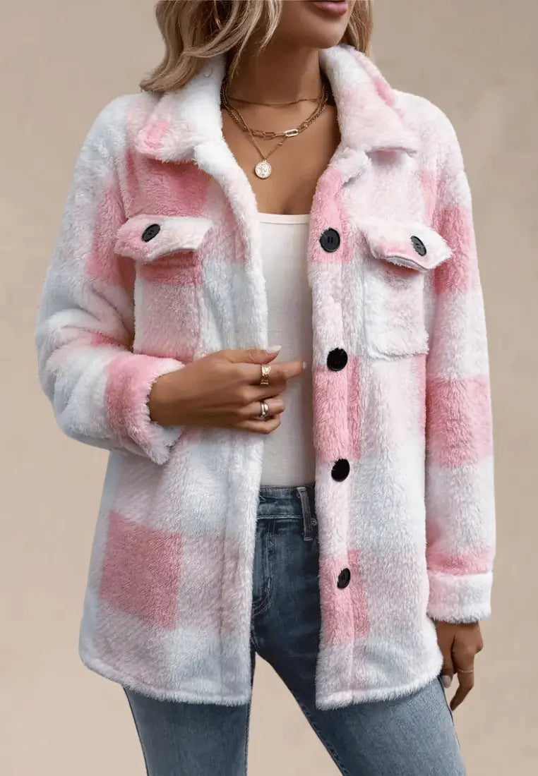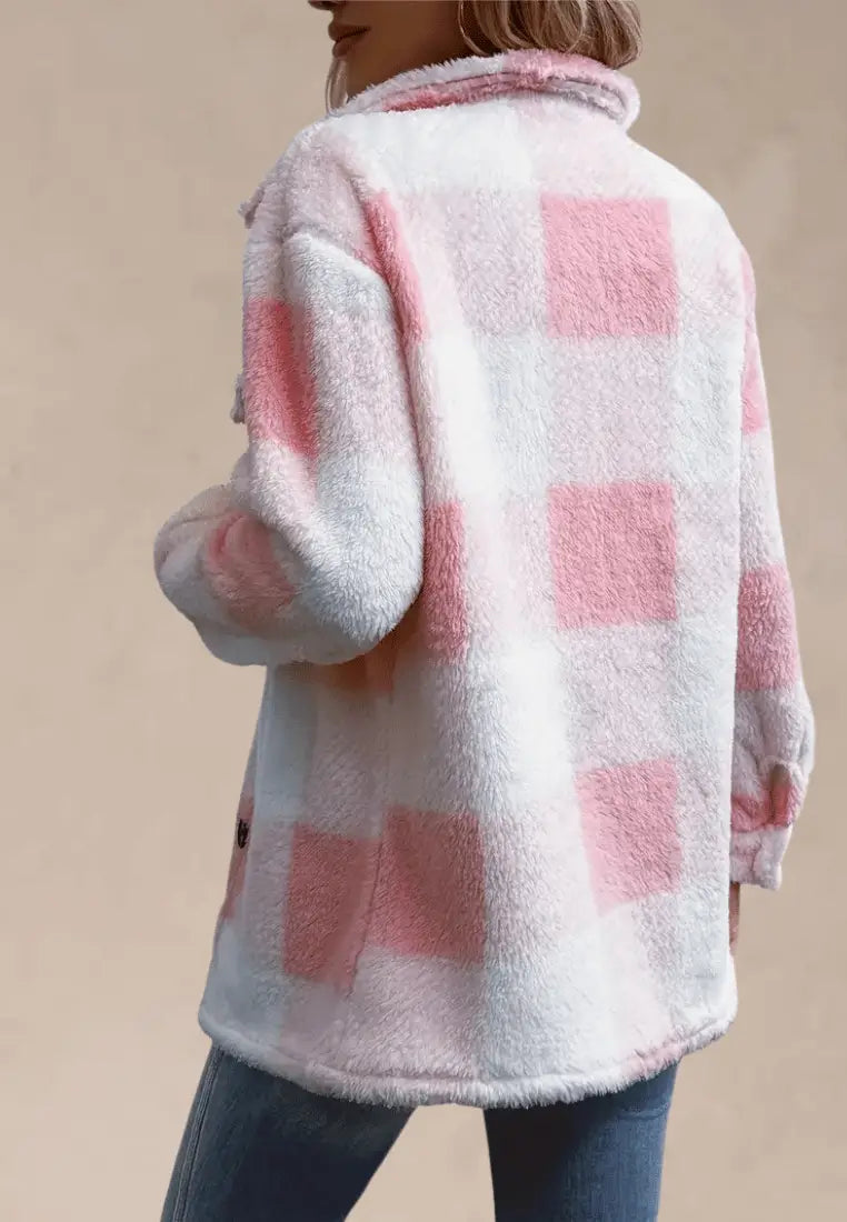 Różowa kurtka damska polarowa długa w kratę z guzikami