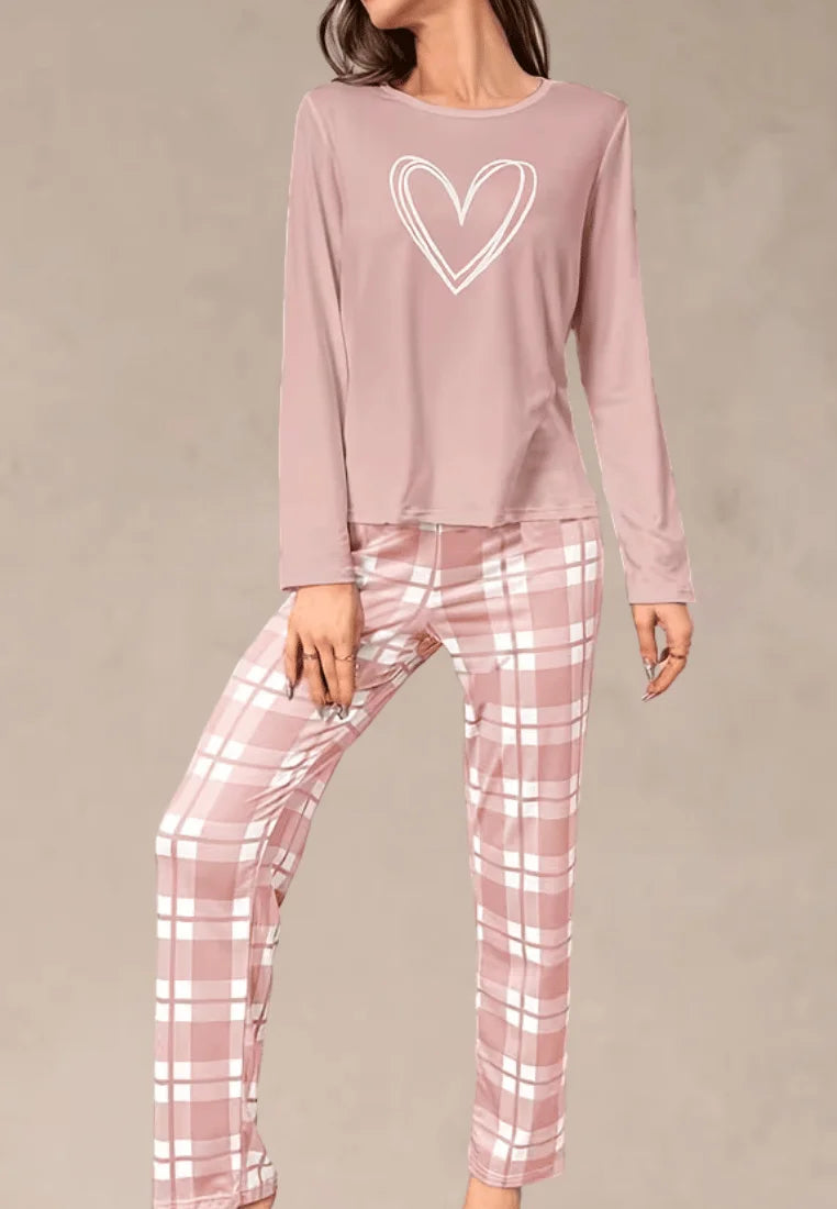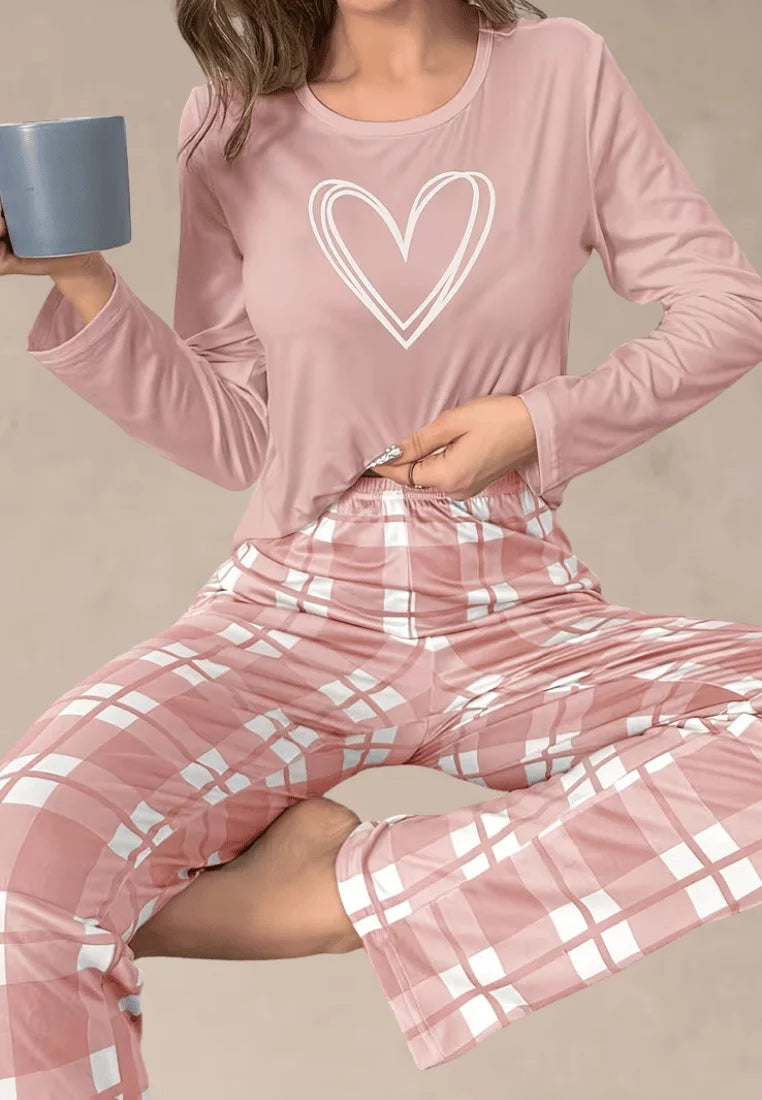 Uroczy i niezwykle komfortowy komplet piżamowy w delikatnym, pudrowo-różowym odcieniu, idealny na spokojne wieczory i relaksujące poranki. Gładka koszulka z długim rękawem została ozdobiona subtelnym nadrukiem serca, który dodaje całości dziewczęcego uroku.