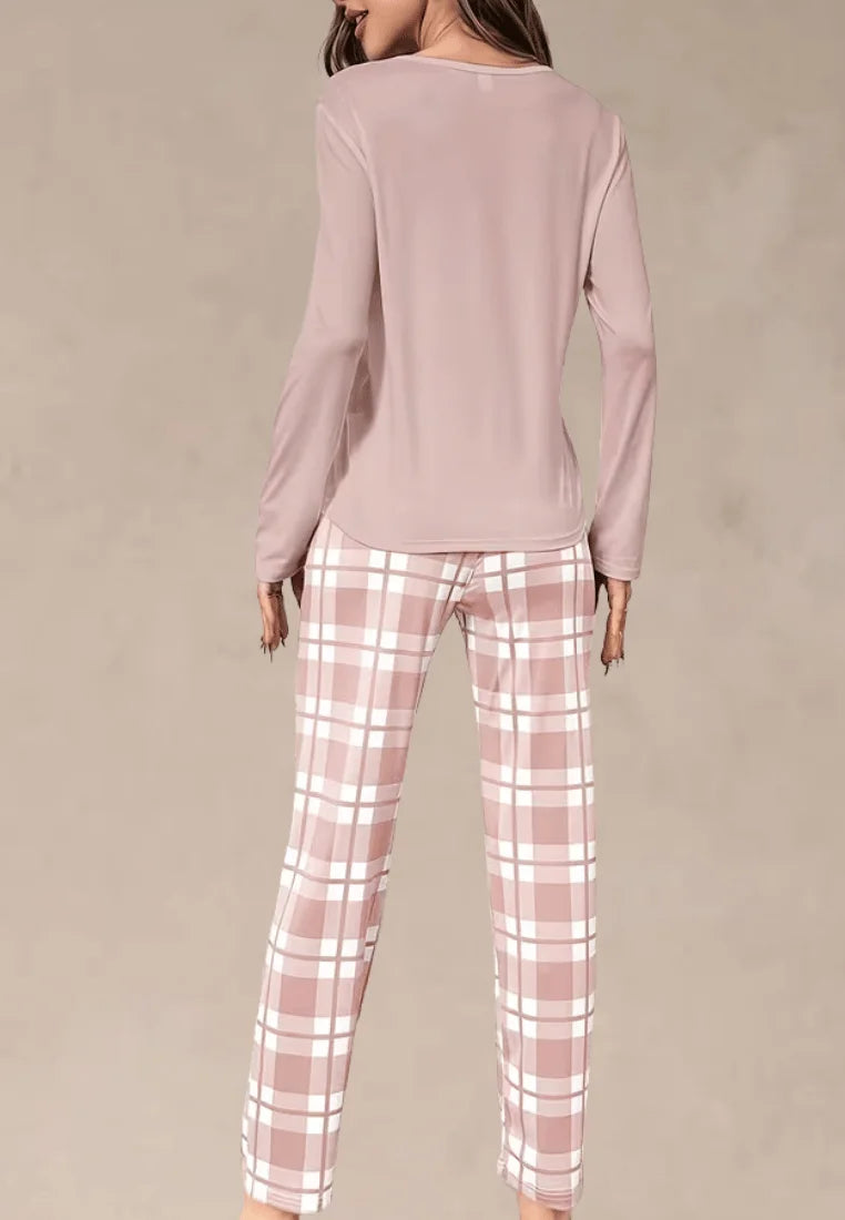 Długie spodnie w klasyczną różową kratę pięknie komponują się z górą, tworząc spójny i stylowy zestaw. Miękki, przyjemny w dotyku materiał zapewnia swobodę ruchów i wysoki komfort noszenia.