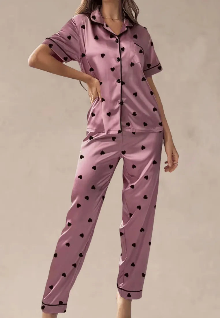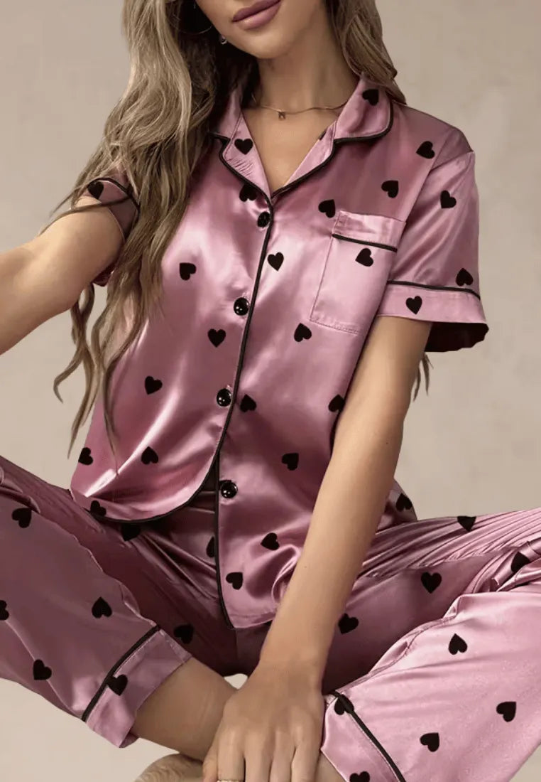 Stylowy i niezwykle funkcjonalny komplet wykonany z czystej, satynowej tkaniny, która pięknie układa się na sylwetce i przyjemnie chłodziwa. Pudrowo-różowy kolor w tekście z uroczym określeniem czarnych serduszek stanowi królewski i elegancki zestaw, idealny na każdą porę roku.