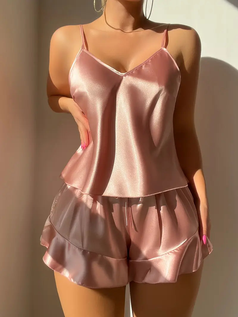 Satynowy komplet piżamowy z topem i szortami Różowy