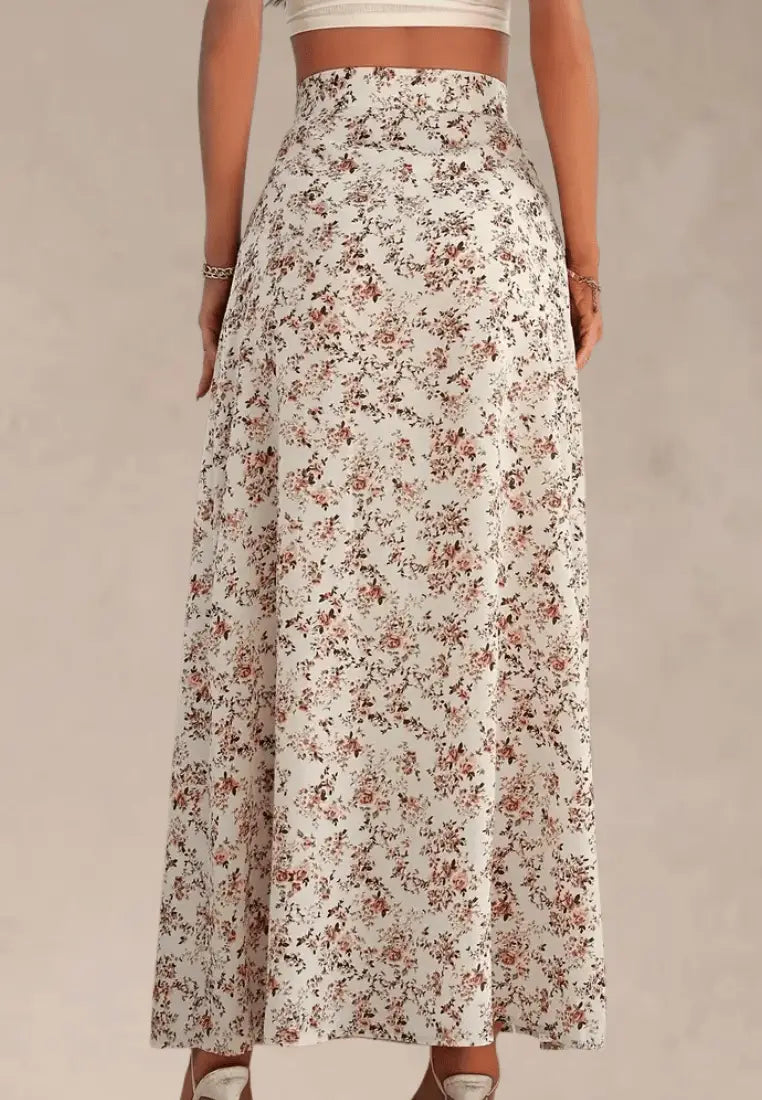 Kremowa spódnica damska rozkloszowana maxi kwiaty rozcięcie wysokisty stan