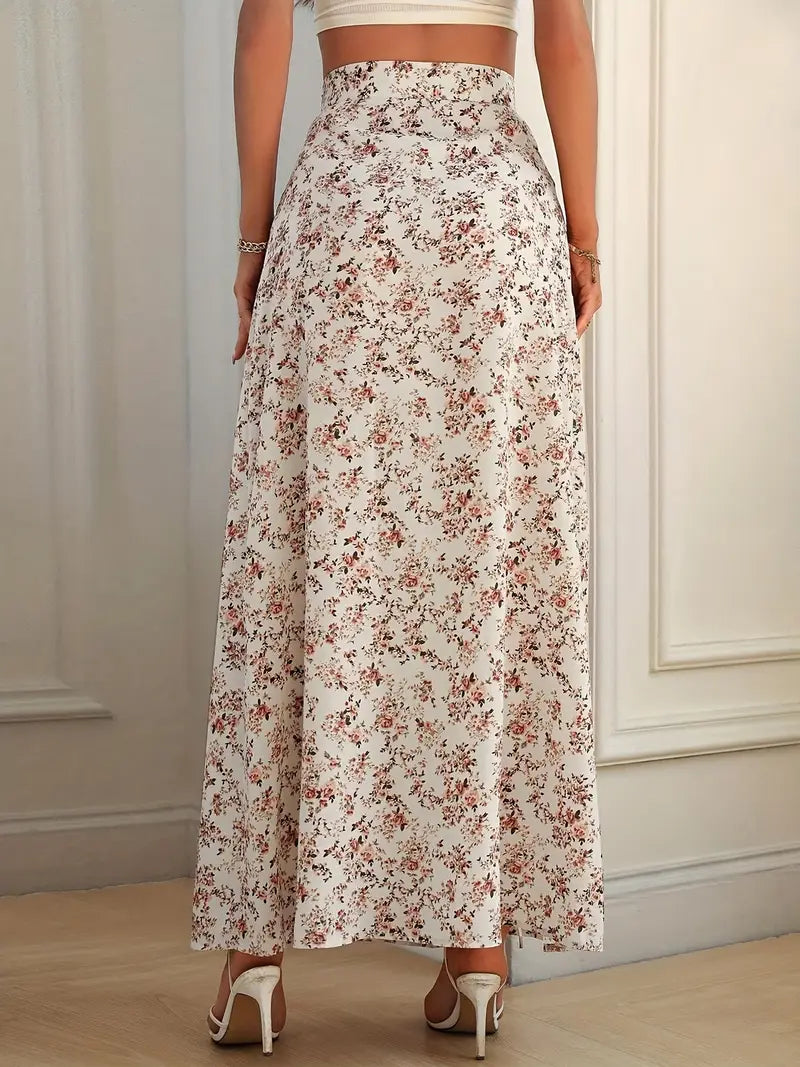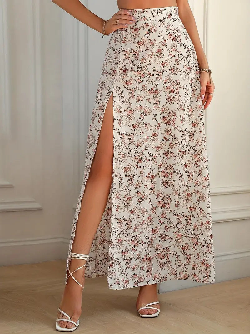 Spódnica maxi w drobne kwiaty z wysokim stanem i rozcięciem