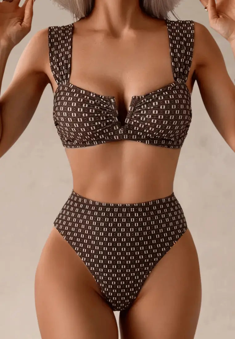 Brązowy strój kąpielowy dwuczęściowy damski w elegancki geometryczny wzór