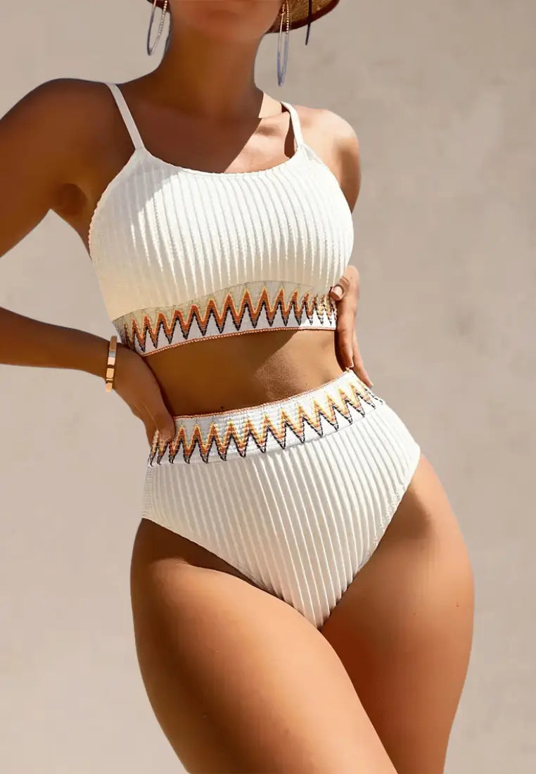 Biały strój kąpielowy dwuczęściowy damski z efektownym zdobieniem