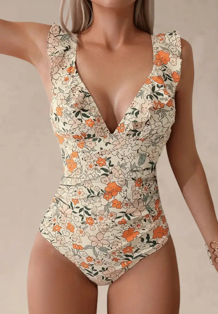 Kremowy strój kąpielowy jednoczęściowy damski w kwiaty z delikatną falbanką