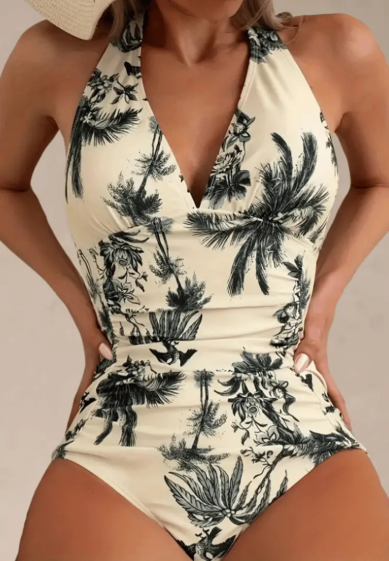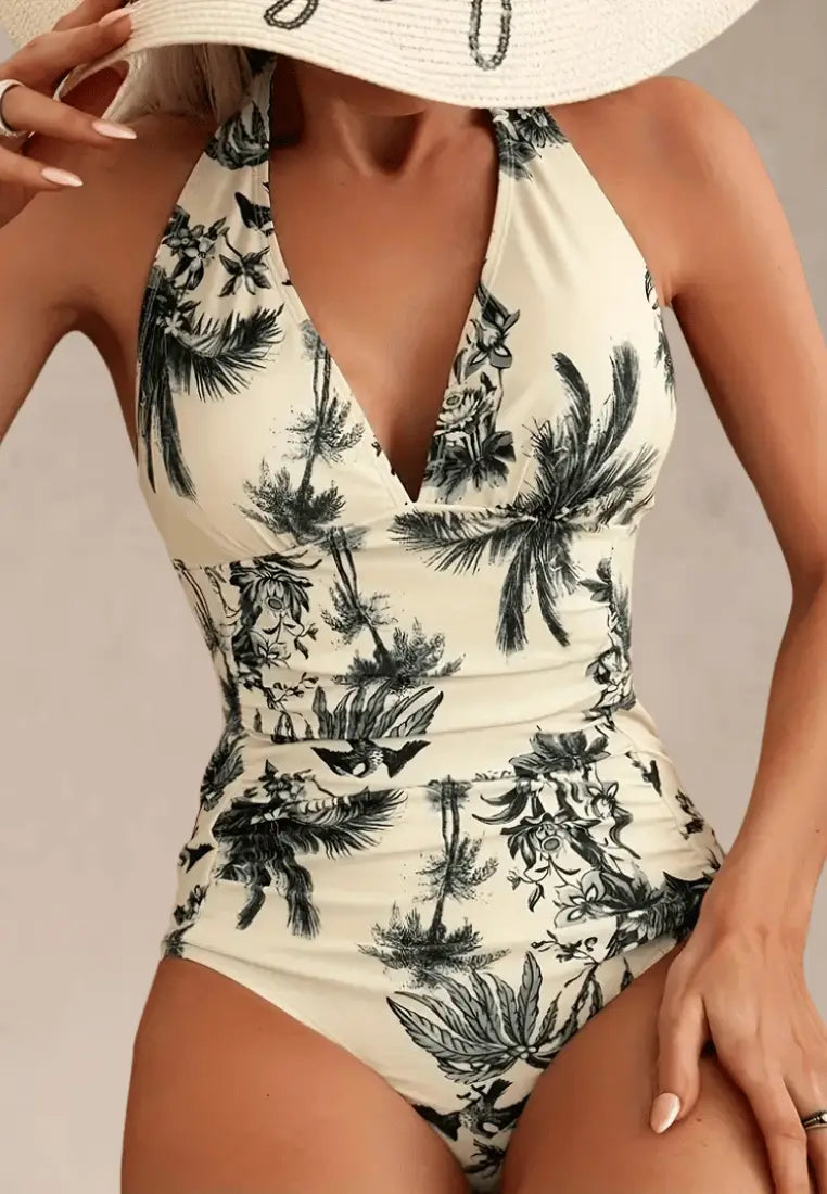Kremowy strój kąpielowy jednoczęściowy damski z tropikalnym wzorem