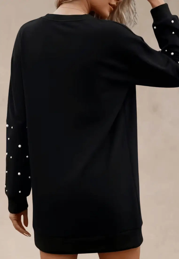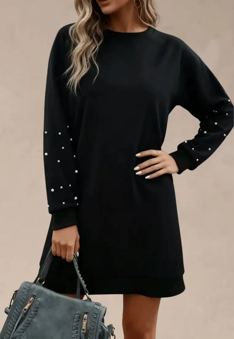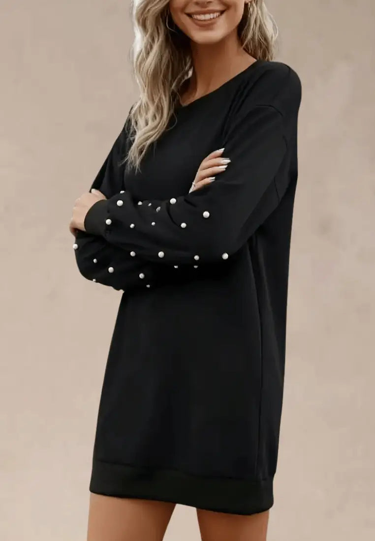 Czarna sukienka dresowa z perełkami i długim rękawem