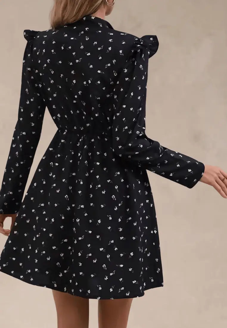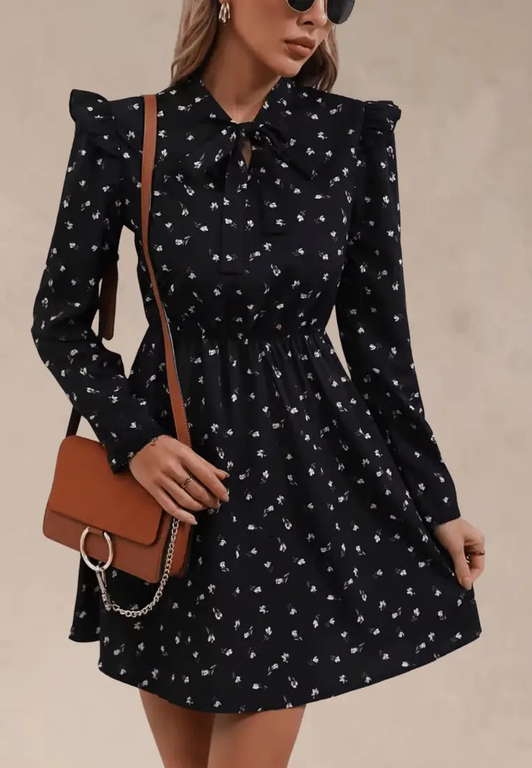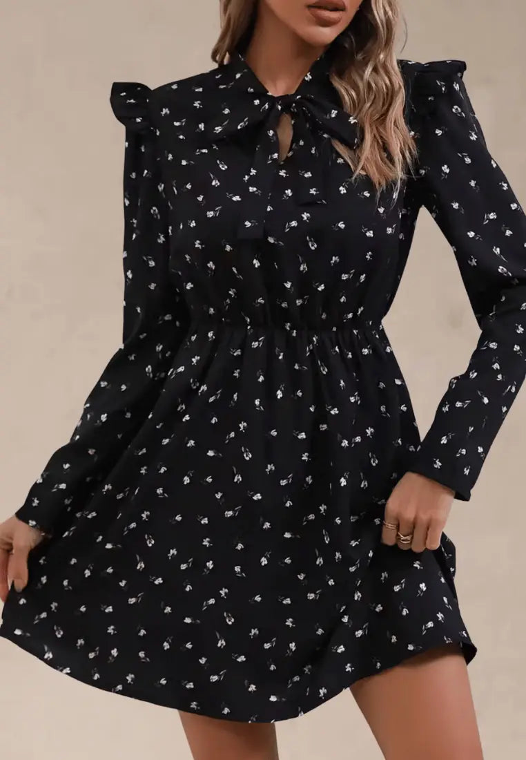 Czarna sukienka w drobne kwiaty z wiązaniem pod szyją i falbanką