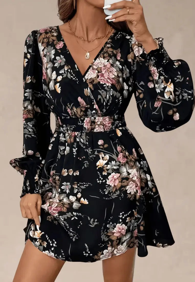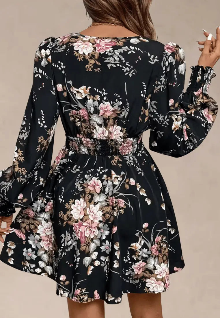 Czarna sukienka w kwiatowy wzór z dekoltem V i długim rękawem