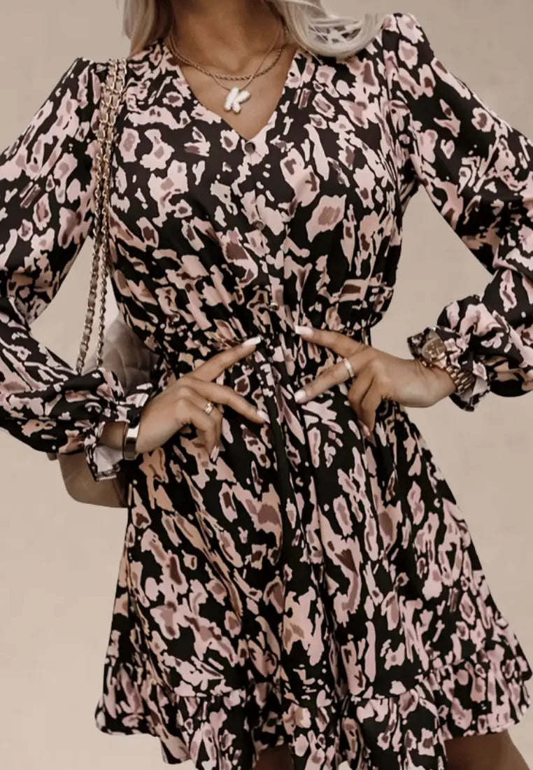 ✨ Sukienka czarna w różowy wzór z falbanką
