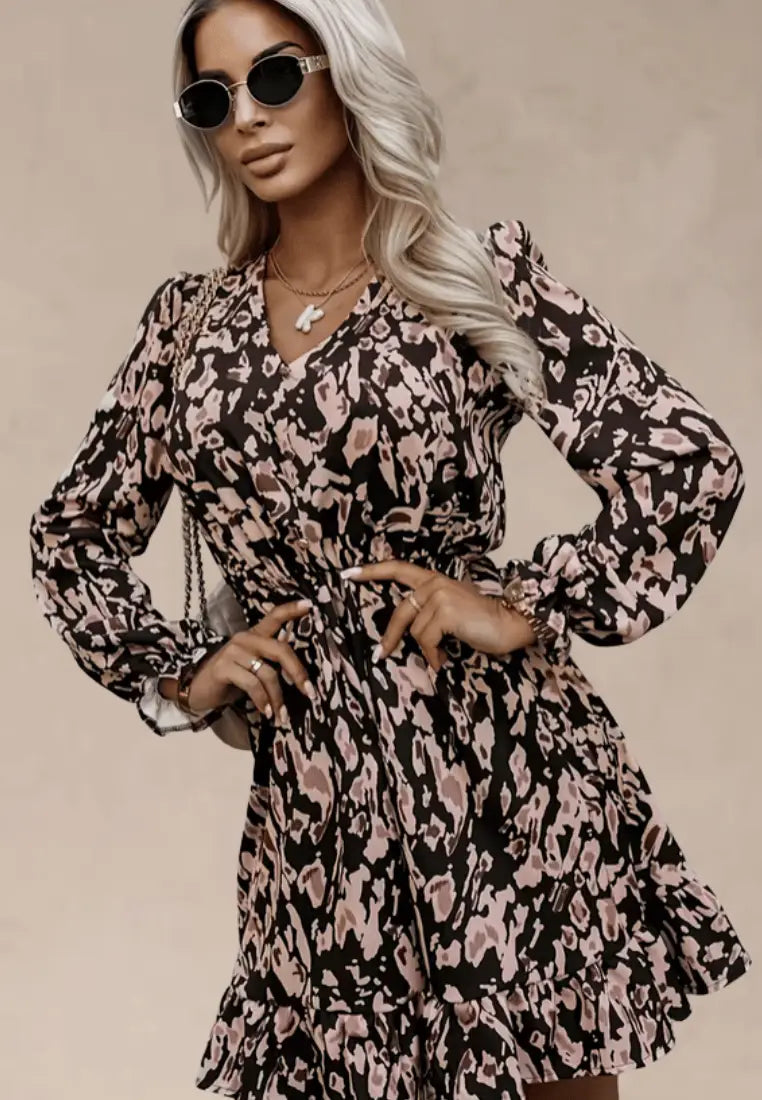 Długie rękawy zakończone delikatnym marszczeniem nadają sukience bardziej romantyczny charakter, a zwiewny dół z falbanką podkreśla każdy ruch. To model idealny na randkę, spotkanie z przyjaciółmi czy elegancki spacer po mieście.