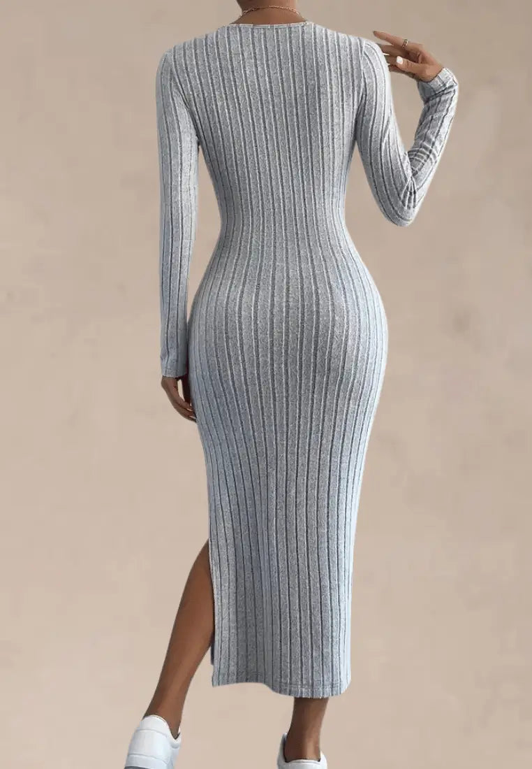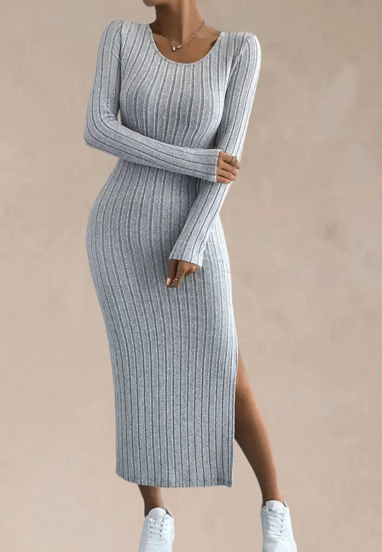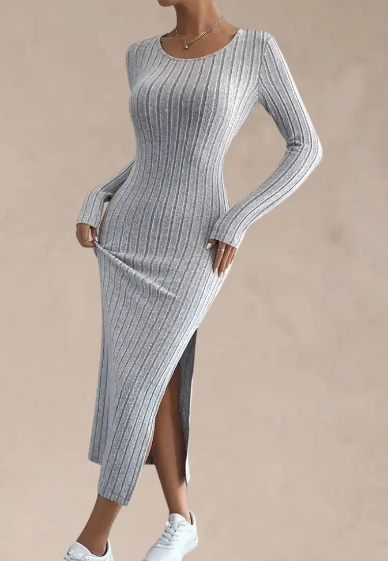 Szara sukienka dopasowana midi z prążkowanej dzianiny i rozcięciem