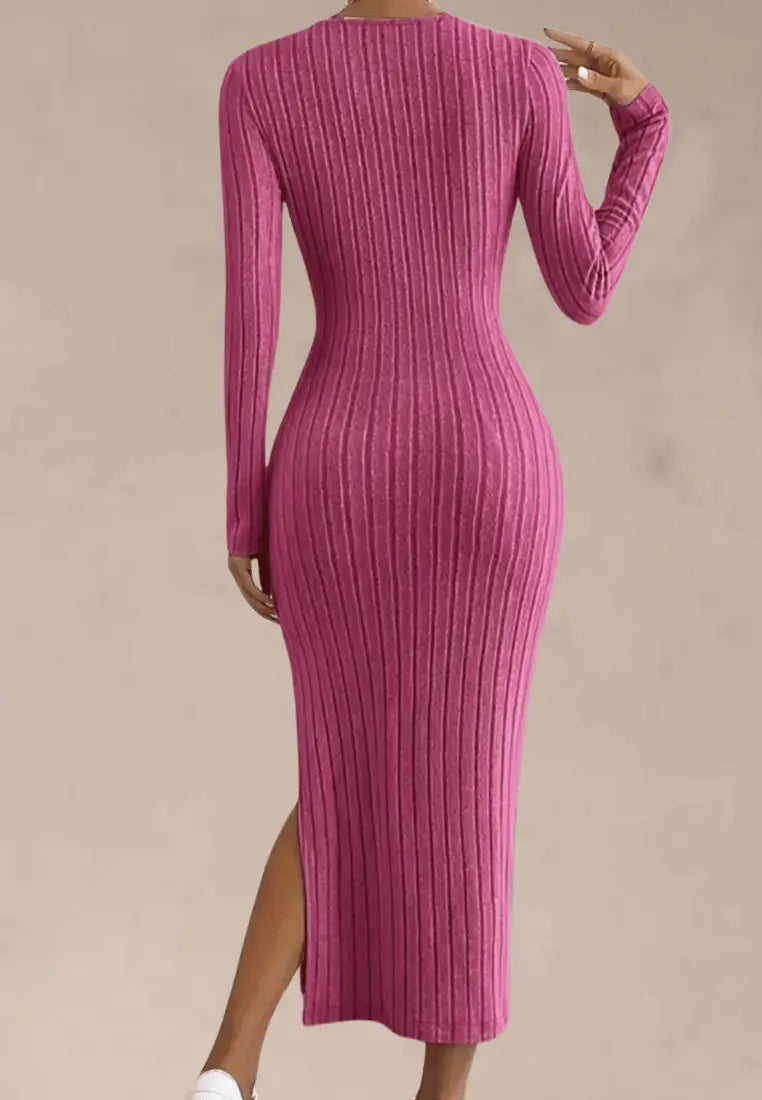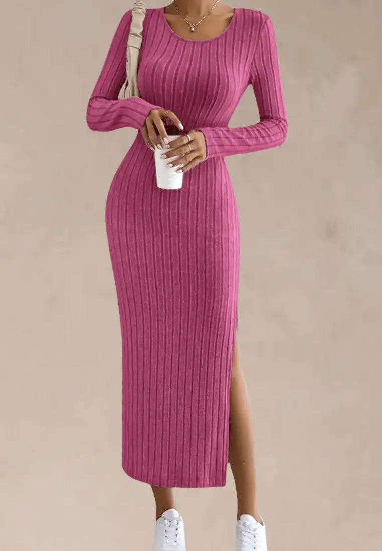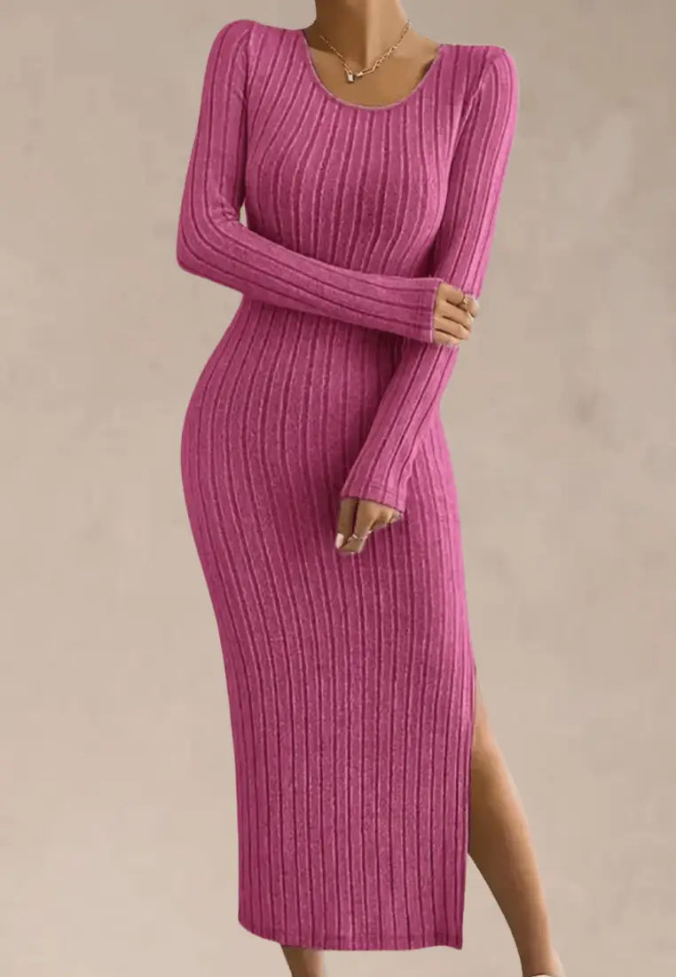 Różowa sukienka dzianinowa dopasowana z rozcięciem na nodze