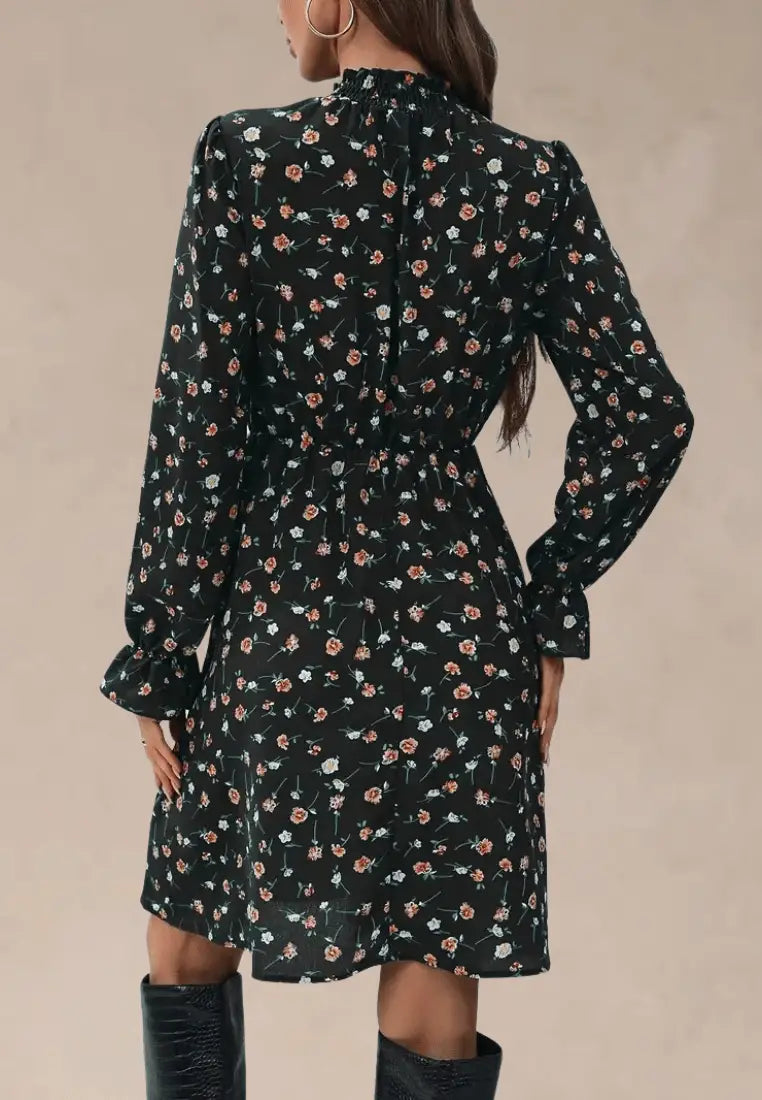 Czarna sukienka w kwiaty ze stójką i długim rękawem
