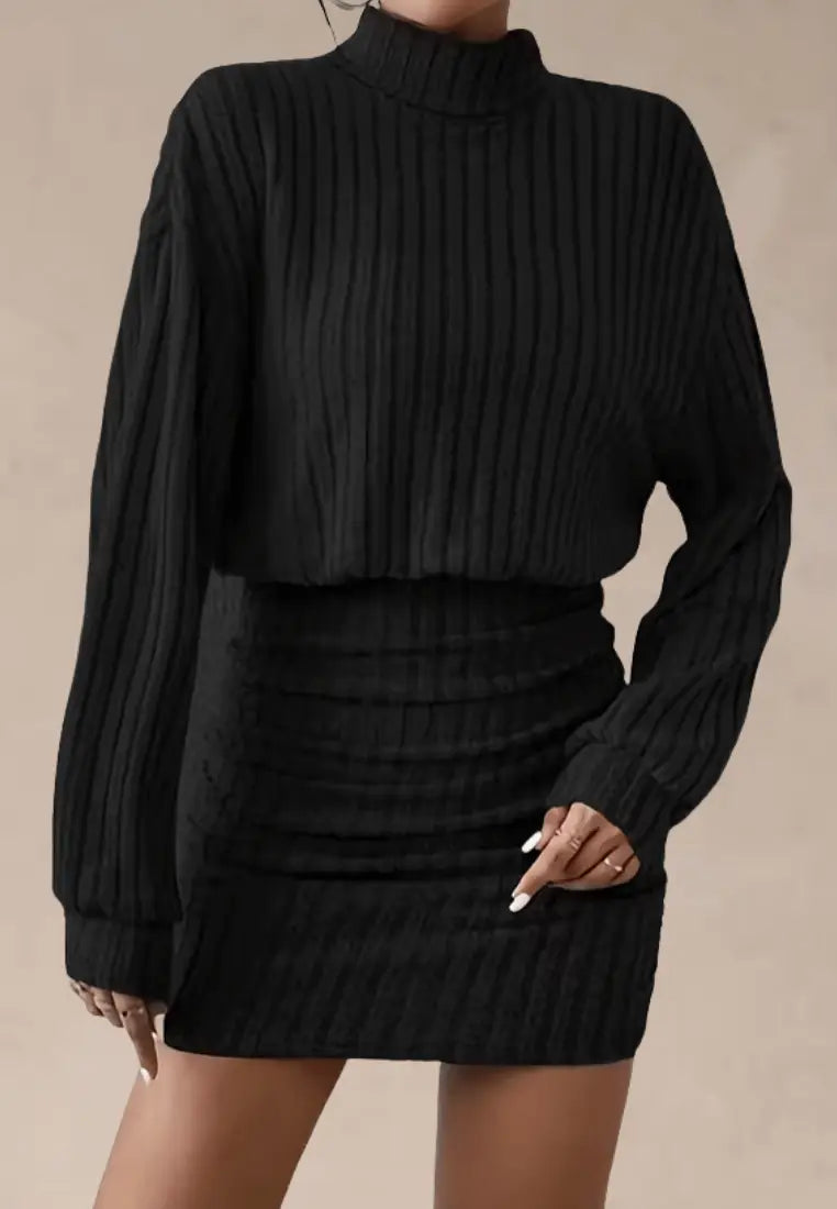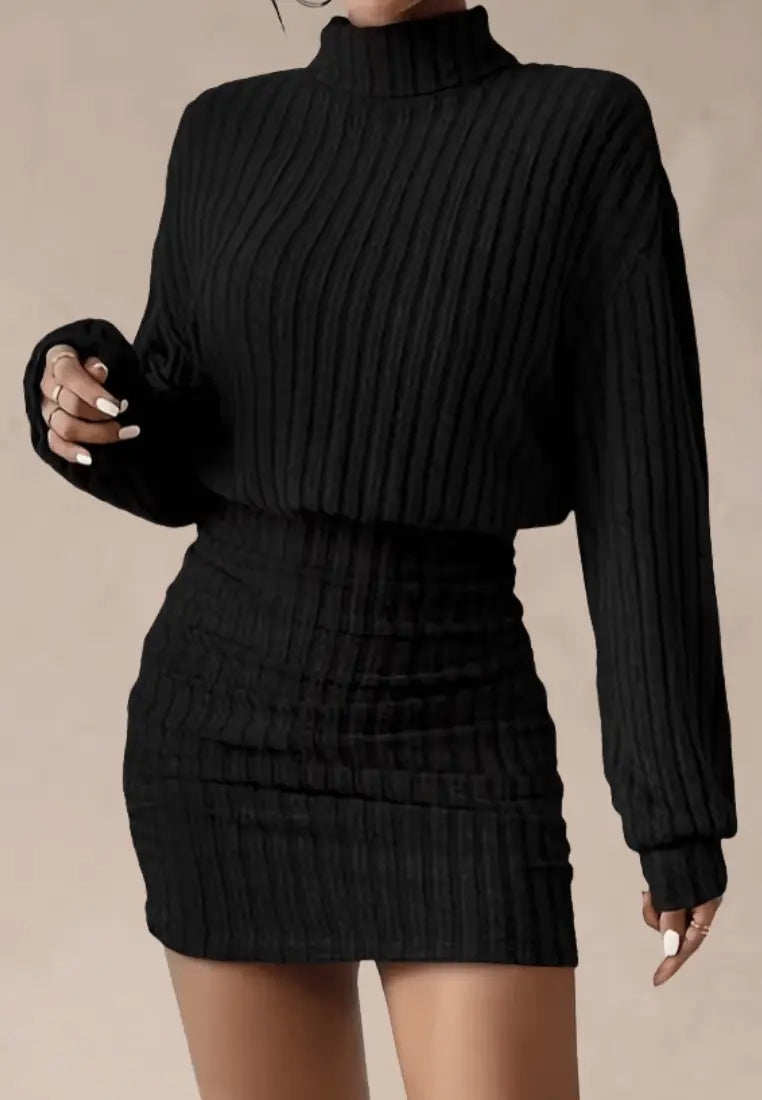 ✨ Sukienka dzianinowa czarna z golfem i prążkowaną fakturą