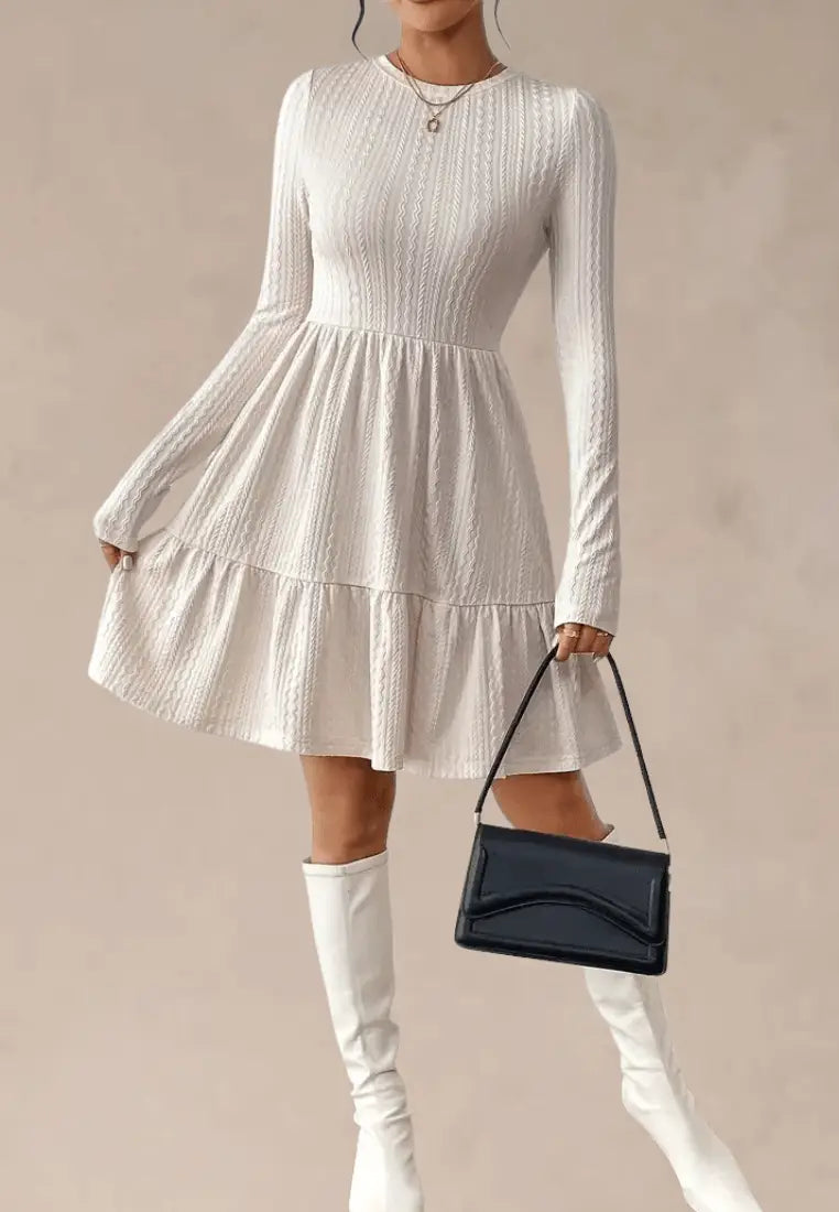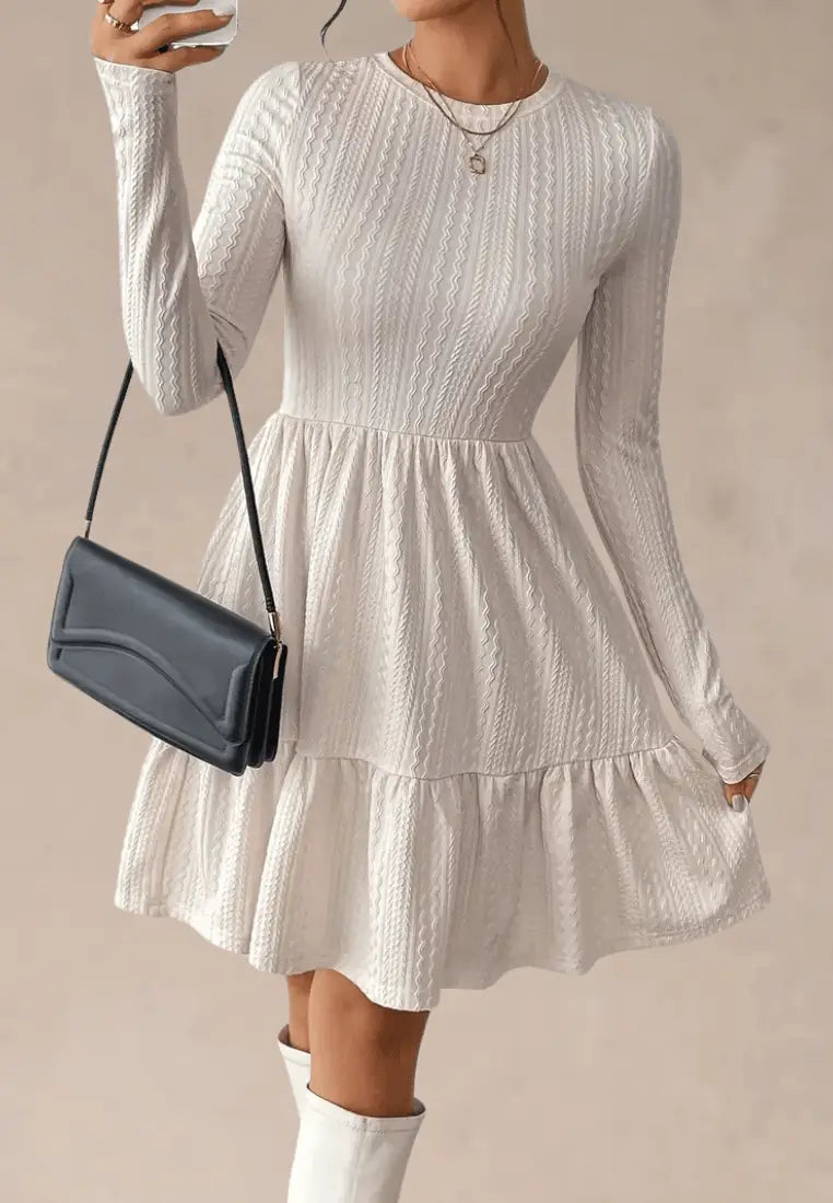 Urocza sukienka dzianinowa ecru z falbaną i długim rękawem to kwintesencja kobiecego wdzięku i komfortu. Wykonana z miękkiej, elastycznej dzianiny, doskonale dopasowuje się do sylwetki, zapewniając wygodę przez cały dzień. Subtelny, prążkowany wzór nadaje jej elegancji, a rozkloszowany dół z delikatną falbaną dodaje lekkości i romantycznego charakteru. Długi rękaw sprawia, że to idealny wybór na chłodniejsze dni.