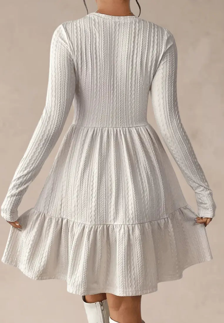 Ta sukienka dzianinowa ecru z falbaną i długim rękawem sprawdzi się zarówno w codziennych stylizacjach, jak i podczas wyjątkowych okazji – wystarczy dobrać odpowiednie dodatki.