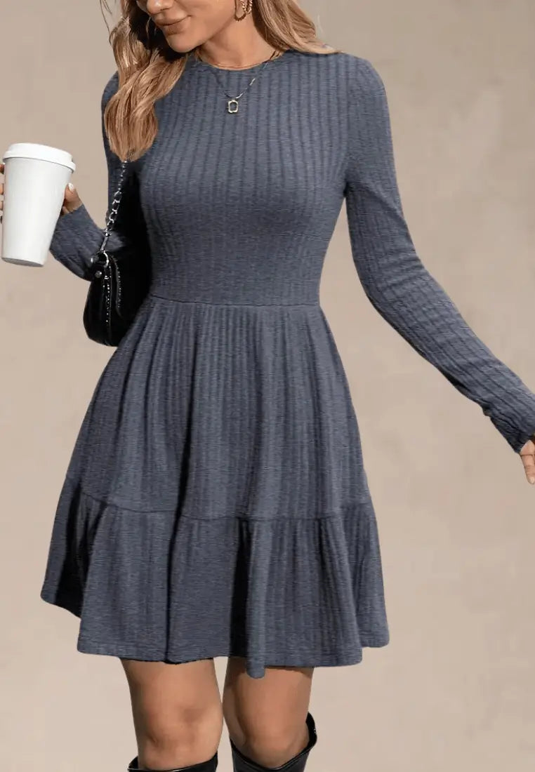 Długie rękawy oraz przyjemna w dotyku tkanina sprawiają, że sukienka świetnie sprawdza się w chłodniejsze dni. Można ją nosić zarówno na co dzień, jak i na wieczorne wyjścia – wystarczy zmienić dodatki. Ta grafitowa sukienka prążkowana z rozkloszowanym dołem to uniwersalny element garderoby, który łączy styl i komfort w najlepszym wydaniu.